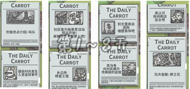 ⚠️剧透警告,更新至第44天解锁地点/商店上新外的日报随机出现~无固定顺序~随机出现!很有趣的小设计。记录每天剧情~安卓tap版~玩到哪更到哪~部分剧情提高npc的好感度后解锁:第28天装修码头、33天装修阿琪家、35天装修莫卡家第1天:《蘑菇村内发生入室盗窃事件》乡公所对话长颈鹿解锁阿琪家。第2天:《钓鱼热点介绍—码头》尤里店二楼刷出钓竿,购买后解锁码 头钓鱼。第3天:《乡公所