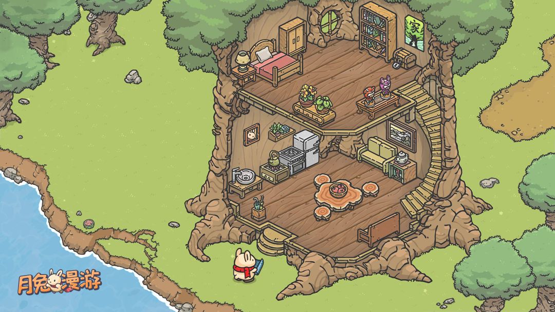 《月兔漫游》是HyperBeard《月兔历险记》的续作,这一作改掉了往日的横向视角,从新的角度去观察新的蘑菇村。所有的功能按键都变简洁了,跟手机界面一样在游戏界面下面分布着背包、手机和设置,看着画面也舒服了不少。《月兔漫游》保留了前作的一些优秀玩法,玩家依旧还能让月兔去码头吹着海风,听着悠扬的音乐钓鱼;然后让月兔去狐狸尤里和他女儿皮皮的商店买东西;去拜访东安的修理店,购买装饰树屋的墙纸和地板..