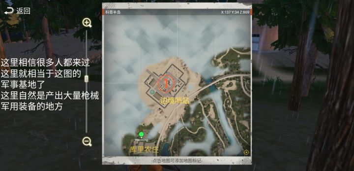 玩了一天,如有错误,望提出!红色字;高危险区(有boss,特殊怪)金色字;强烈推荐必刷的图!蓝色字;中危险区(无boss,少量特殊怪)绿(白)色字;低危险区(只有普通怪)紫色框框;推荐建家的地方,都接近物资点,丧尸和狼都很少!橙色圈;有个小房间,有这个蓝色的花!用枪打一下中间的花果,会触发战斗(换了个新的Bgm)Boss定期会吐出绿色的口气,会吸引周围的丧尸,人物被喷到后会获得中毒!
