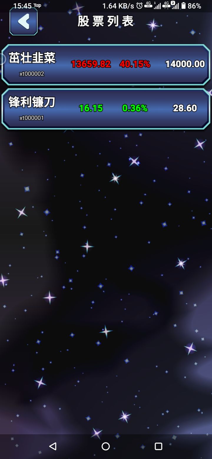 预计周末会更新一个版本,主要更新内容为:1. 茁壮的韭菜 和 锋利的镰刀 两只系统股票上线,玩家24H随时可以操作,玩家间的对垒,不知道我的服务器能不能抗住!2. 现在的挑战A股改成星级奖励制玩法。3. 上线猜涨跌的新玩法。感谢大家的支持,敬请期待,有建议或意见欢迎留言跟帖,或者直接加群反馈。
