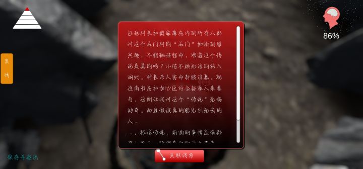 ①细侯=3个小人书②弃子=耳环+手帕+婴儿③无九天=石刻+石锤+梯.子+图纸+石凿④走入深渊=银簪子+佐+坑洞+衣裤+弃子⑤传说=3个壁画⑥报复=死尸+信⑦南书房=俄文+报复+吴九天⑧震荡文=站在洞口外面的(圆圈)点线索(鸟)鸟会变得很丝滑,再点鸟⑨真相=震荡文+传说+南书房⑩彩蛋:点洞里面的(铃铛)会掉下来,点铃铛,石门会有小红点=下集再见—————————————————