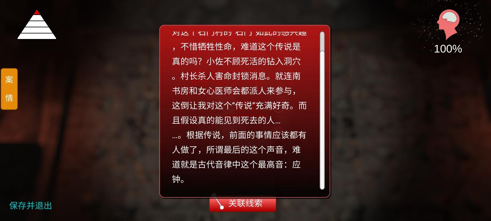 ①细侯=3个小人书②弃子=耳环+手帕+婴儿③无九天=石刻+石锤+梯.子+图纸+石凿④走入深渊=银簪子+佐+坑洞+衣裤+弃子⑤传说=3个壁画⑥报复=死尸+信⑦南书房=俄文+报复+吴九天⑧震荡文=站在洞口外面的(圆圈)点线索(鸟)鸟会变得很丝滑,再点鸟⑨真相=震荡文+传说+南书房⑩彩蛋:点洞里面的(铃铛)会掉下来,点铃铛,石门会有小红点=下集再见—————————————————