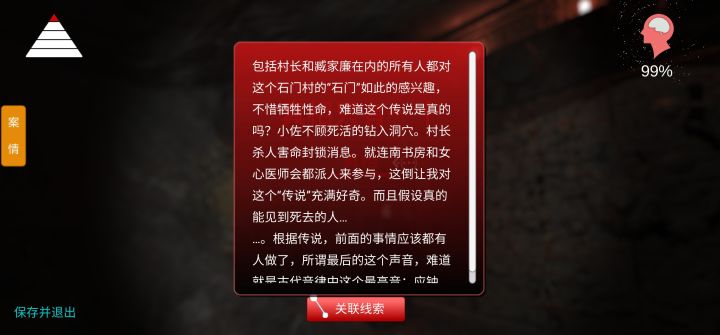 ①细侯=3个小人书②弃子=耳环+手帕+婴儿③无九天=石刻+石锤+梯.子+图纸+石凿④走入深渊=银簪子+佐+坑洞+衣裤+弃子⑤传说=3个壁画⑥报复=死尸+信⑦南书房=俄文+报复+吴九天⑧震荡文=站在洞口外面的(圆圈)点线索(鸟)鸟会变得很丝滑,再点鸟⑨真相=震荡文+传说+南书房⑩彩蛋:点洞里面的(铃铛)会掉下来,点铃铛,石门会有小红点=下集再见—————————————————