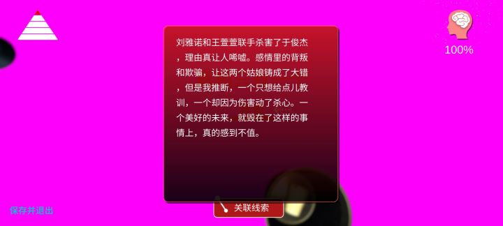 纪念一下,刚玩孙美琪就入迷了,后面手机实在太卡,买了一个新手机,这个游戏卡了好几年,久到我都又买了新手机😂可没想到有那么多同好和大神一直没有放弃,而且把游戏进度达到了100%,感恩。回到游戏本身,刚开始游戏是正常的,后面更新就变成紫色画风一直到现在不过不影响收集证据,这个案子挺唏嘘的,脚踩两只船,摇摆不定要不得,可怜俩女生把自己也配进去了,渣男痛扁一顿,让他身败名裂才解气