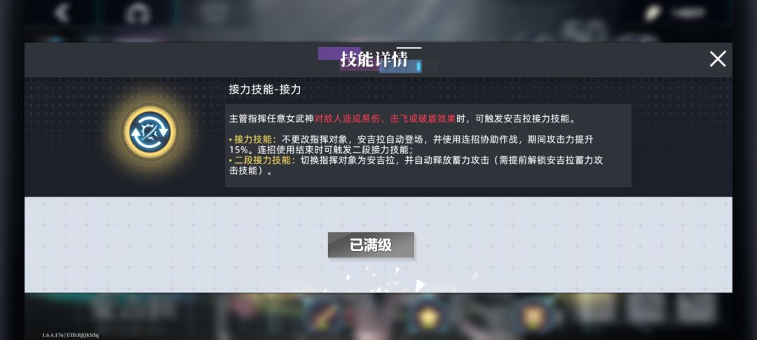 合理利用接力技能,让安吉拉开大期间安全打出伤害。 图1为刀系列角色的接力技能。 图2为法杖系列角色的接力技能。 图3为枪系列角色的接力技能。 图4为盾系列角色的接力技能。 图5为女仆突破2阶段后,蓄力普攻的易伤效果。 图6为女仆延时小技能效果。 再实战中合理利用接力技能可以同时让三名队友在场上打输出,可以提高输出效率。 女仆安吉拉配合,开局女仆蓄力普攻,打出易伤后,点按诗寇蒂和安吉拉触发接力技能。