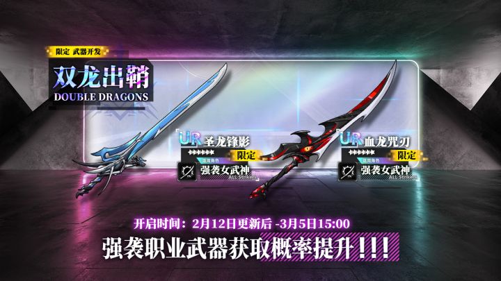 活动时间:2月12日更新后--3月5日15:00活动说明:活动期间,限定开发补给【双龙出鞘】开启。该开发补给中以下武器出现率提升:UR强袭武器 圣龙锋影UR强袭武器 血龙咒刃 以上二者共占UR武器出率50%注意;该开发补给为【限定开发补给】。主管需使用“特别开发许可”进行补给。在限定开发补给中,对应的限定武器在补给关闭后,将不会出现在其他类型补给中。 当期武器效果说明:圣龙锋影:战