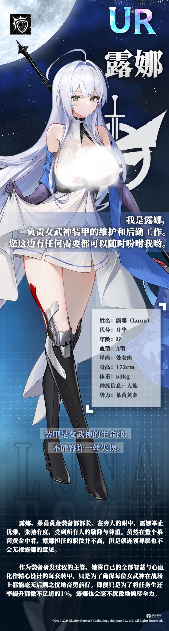 各位主管大人好呀,好久不见,又到了大家最为期待的女武神档案栏目,掌声!☆´∀`☆今天言言要为大家介绍的女武神,很多主管应该并不陌生,那就是在主线剧情与夏日剧情中曾登场过的——露娜。在之前的故事中,露娜一直给人一种城府颇深的印象,今天就让我们看看,这位女武神的身上又有着怎样的秘密吧~!作为装备部的部长,不管是在部下还是在朋友面前,露娜却总是给人一副温柔贤惠的印象。在工作中露娜仔细认真,对待部下通