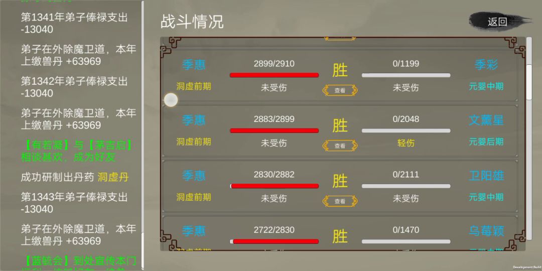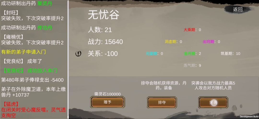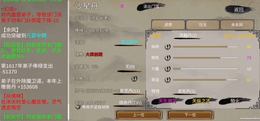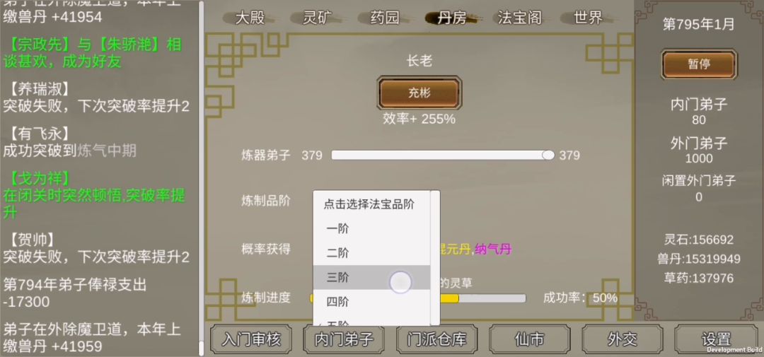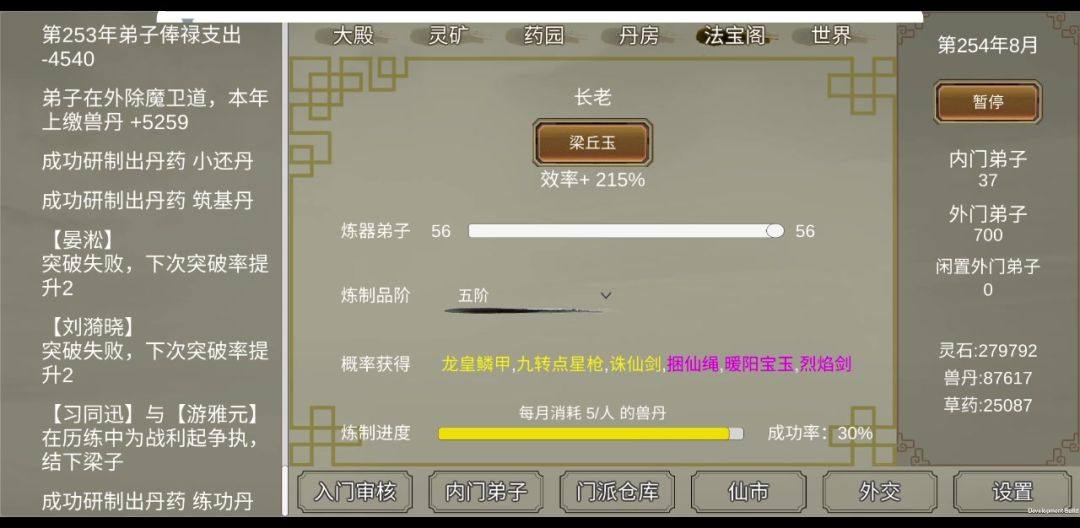 用的是丹宗的后期发育流,到了后期直接把一千名外门都放到炼丹,然后开抢所有宗门,不过夔牛血脉确实十个bug……