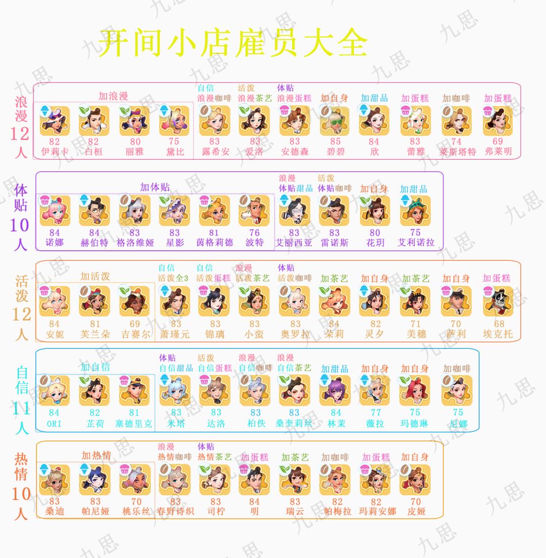 这个渠道都没人发攻略贴了,人也越来越少了,但也有人坚持,发个雇员大全吧,不懂玩的玩家,阵容考虑浪漫和体贴就好了。#开间小店