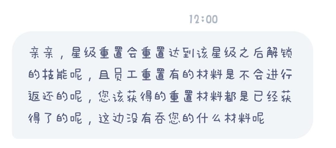 员工重置有两种 1.重置员工 花费100钻 【重置范围】→【返还使用过的材料】 员工等级→升级证书、员工经验、金币 员工技能→技能材料 员工评级→菜品经验 (菜品升星的等级不会重置,所以使用的材料也会不返还) 2.重置星级 花费300钻 【重置范围】→【返还使用过的材料】 星级等级→包含本体、紫卡、蓝卡 技能等级→不返还材料 (所以如果想返还所有材料,需要先重置等级,再重置星级。不然就会吞技能材料