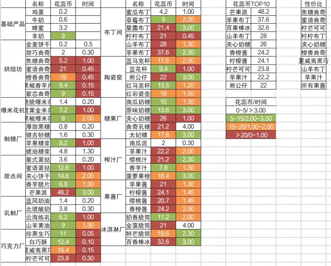 你们人怪好的嘞,都没人催我,配合升级产量、原材料获得来算甜点间、烘培坊、乳制厂的产品更适合,一些价格过低的没进行分类,表格中后期用于参考,前期有什么放什么就行