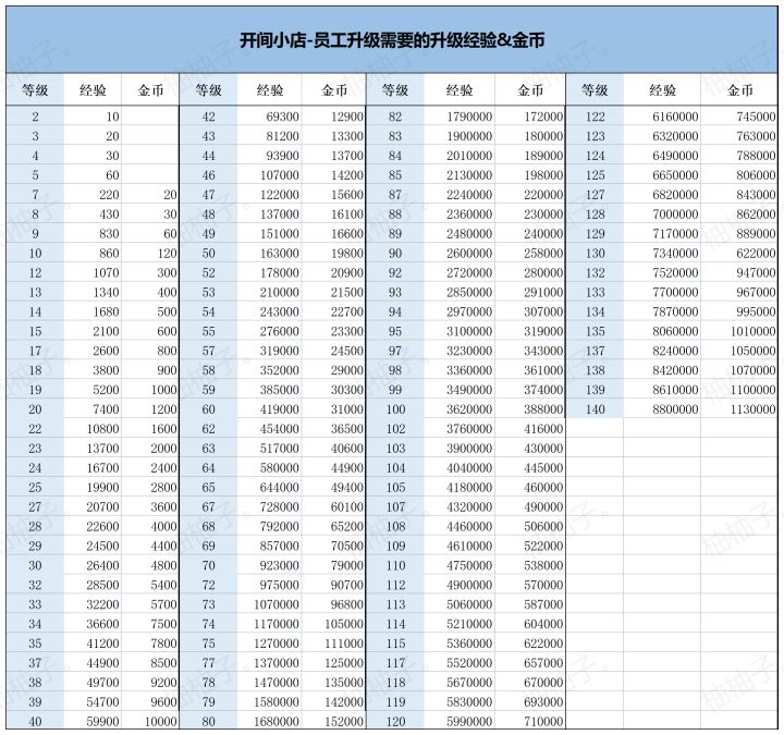 开间小店员工升级相关 — 升级经验&金币&升级证书