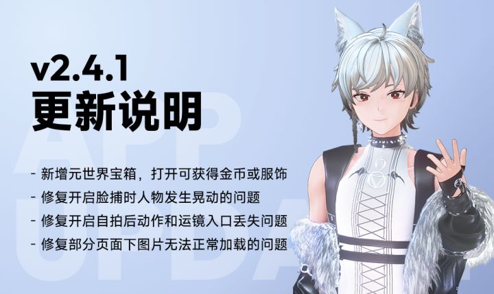 在2.4.1版本更新后,Vyou发生的重要改动如下:一、任务系统的变化2.4.1版本在强升后,任务和宝箱系统会出现一些变化,大家可以领取到的V币也提升啦!相比老版本增加了350V币的奖励。重启App之后就可以看到全新的任务列表啦!加上通过宝箱获得的奖励,用户每天可获取的V币数量将提升为1250V币。新版本的每日奖励如下:元世界宝箱:20V币*35宝箱 = 700V币每日任务:100V币