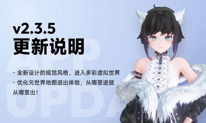 Vyou微你将于今日发布新版本,根据审核的速度,大家可能会分批次收到更新的信息~本次更新内容日志如下:-全新设计的视觉风格上线,Vyou界面将变得更加多彩鲜活。-优化了元世界地图的进出体验,实现了虚拟人物从哪里进就从哪里出。具体后续更新进度,请关注官方的最新动态!