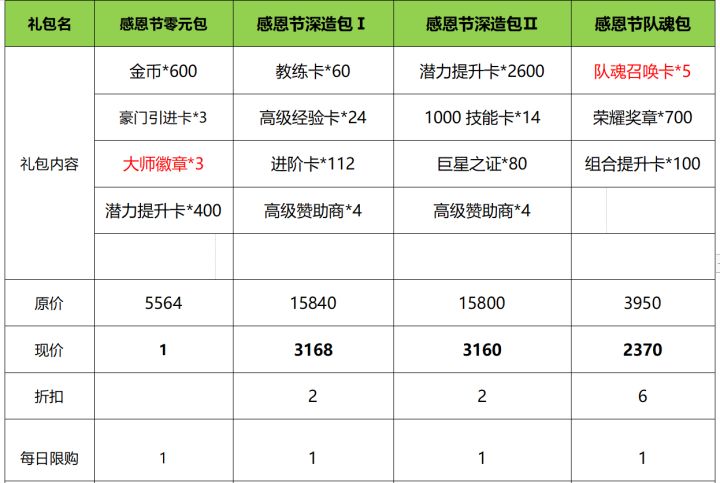 绿杨带雨垂垂重。五色新丝缠角粽。美好的时节再次到来,又是一年五月五。大家在赛龙舟、吃粽子的同时也不要忘记登录我们游戏哈,当然我们也为各位经理带了丰富的活动以及特惠礼包,另外偷偷告诉大家还有一个准点惊喜以及不停服的阵容挑战更新哈~那么我们直接进入正题环节~ 一、活动1.队魂订制:活动详情:玩家自选订制充值礼包,产出队魂召唤卡,组合提升卡活动奖励:队魂召唤卡、荣耀奖章、组合提升卡、完美退役卡等