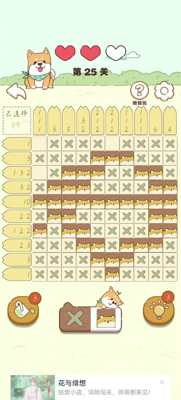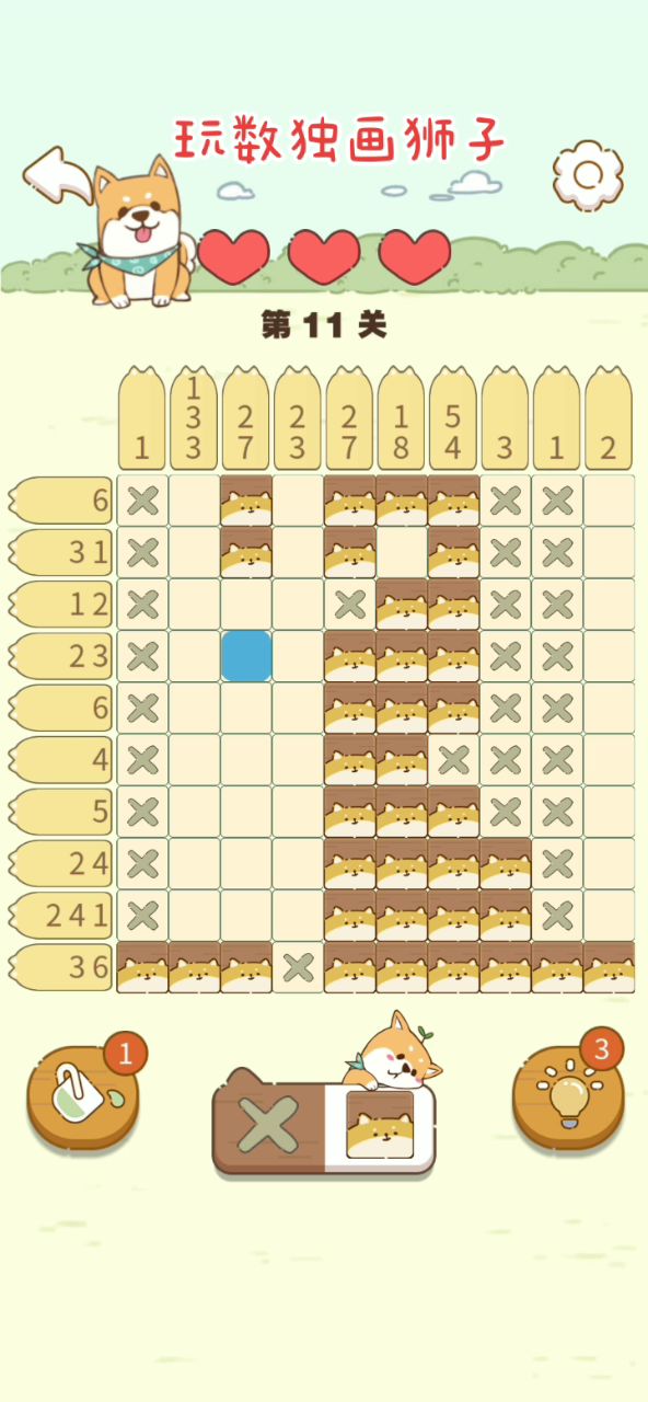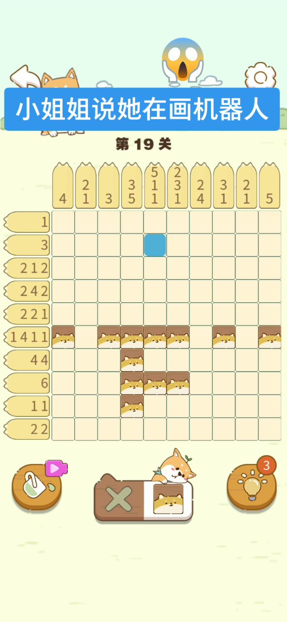 第13关,最底部一排是10,第一步,刚好把这排填满就好。 第二步,很好的着落点就是,看最上面,每一列的底部数字是几,就表示从第10排往上有几个狗块。