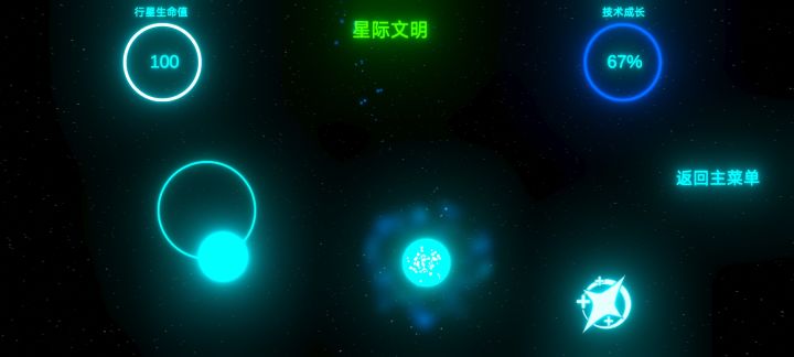 没有攻击的选项,哪怕是神级文明,你所能做的就只有躲避和选择性的触碰。 绿色的星球看上去很像黄色。 白色可以增加生命,紫色可以发展文明,褐色会失去生命。。。 在前期哪怕是紫色的,你触碰之后依旧会减少生命值。。。 说实话,不推荐,可玩性太少。 封面是他们的玩法说明。。。