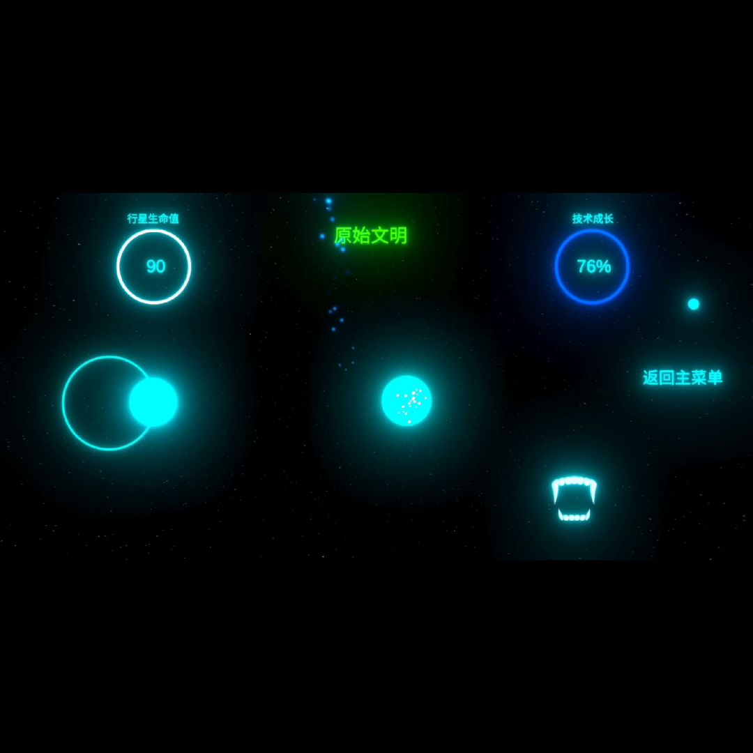 没有攻击的选项,哪怕是神级文明,你所能做的就只有躲避和选择性的触碰。 绿色的星球看上去很像黄色。 白色可以增加生命,紫色可以发展文明,褐色会失去生命。。。 在前期哪怕是紫色的,你触碰之后依旧会减少生命值。。。 说实话,不推荐,可玩性太少。 封面是他们的玩法说明。。。