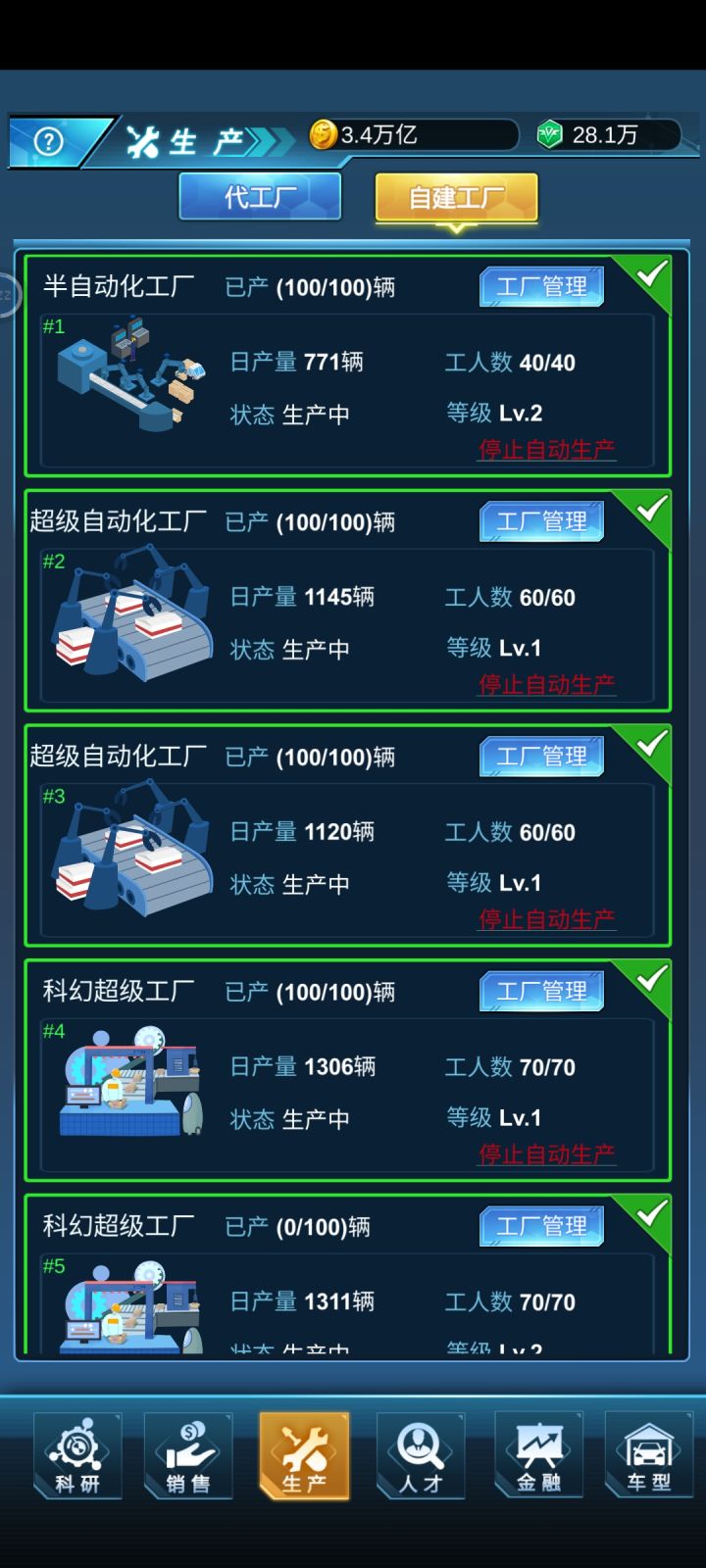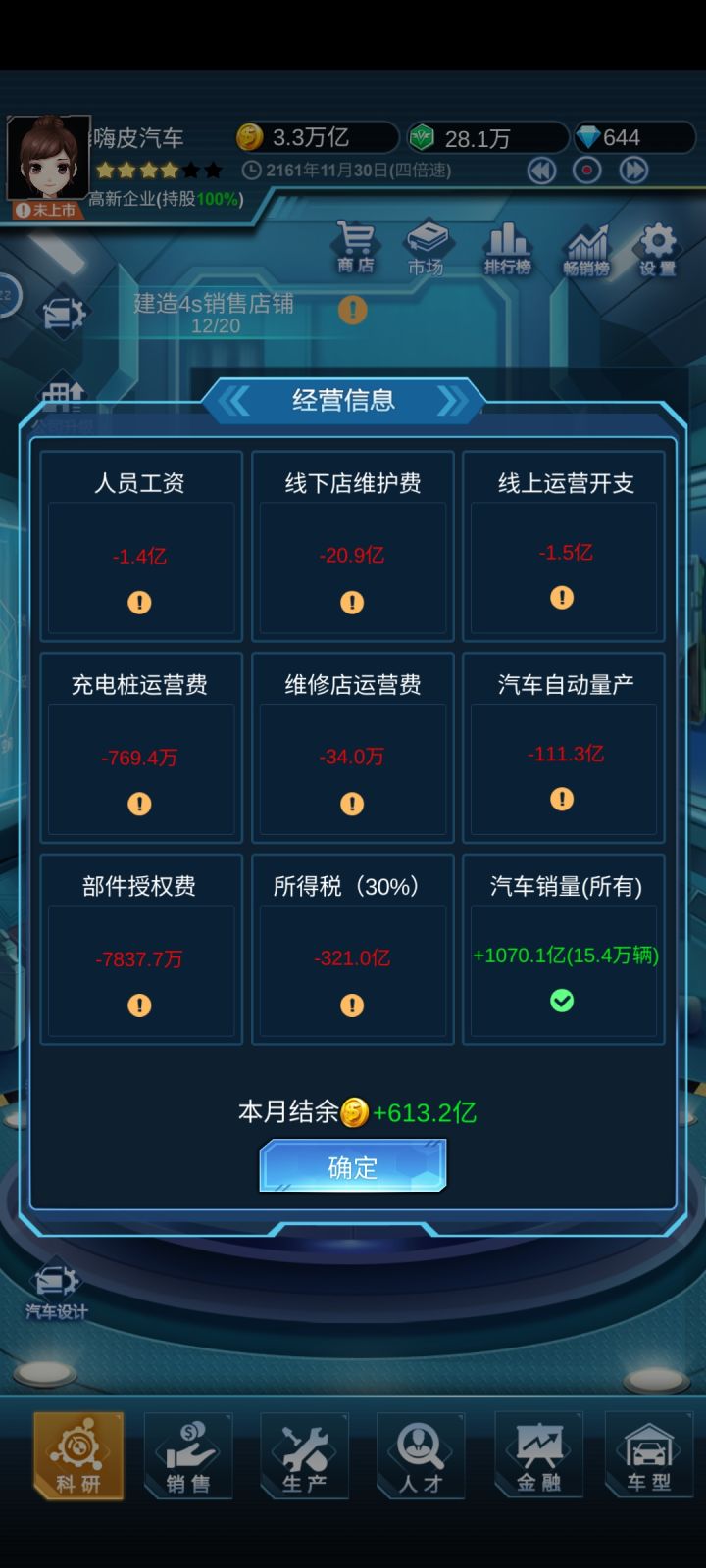 给后来的说一下经验,其实就是造车开卖。进去你的第一辆车尽量把配置能拉多高拉多高,这样子利润才多点。因为没有AI竞争,所以无论你造多少车都是能卖完的,无非就是快慢问题,所以利润都拉满。