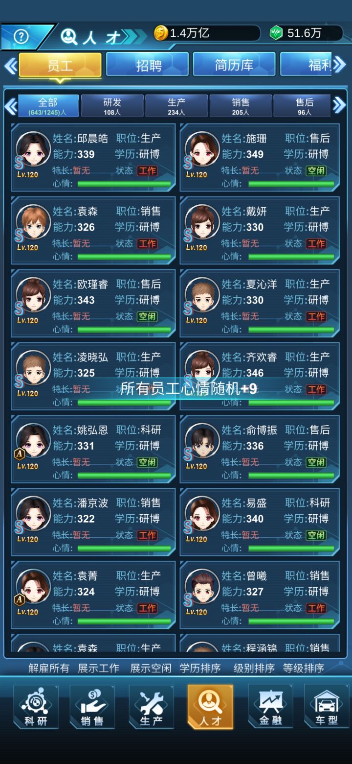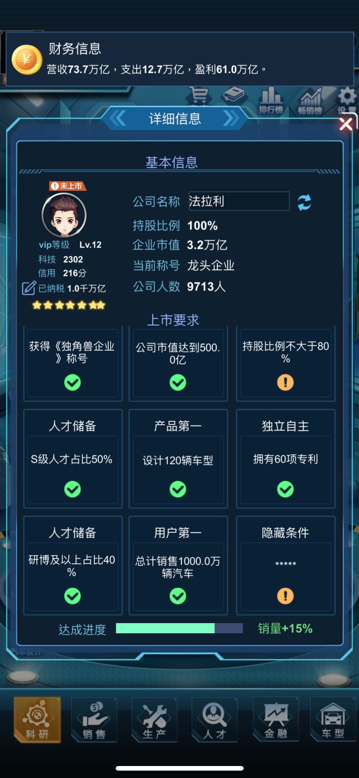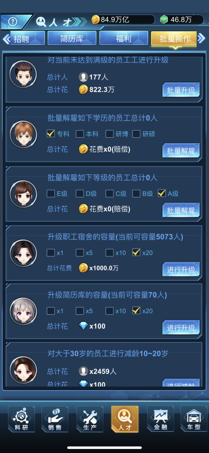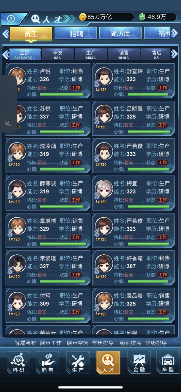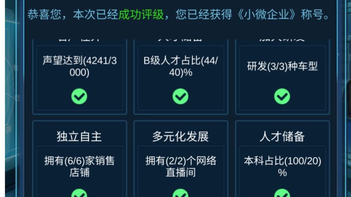 还有s等级的人一开始不要,跟着那个左边的公司升级的条件走,不要早点,还有注意五星企业之前那个售后的人全不要,充电桩售后服务全不要。其他就依葫芦画瓢没啥意思了。那个投资没卵用,要钱还不如存钱拿利息,后面钱没卵用就是等卖的车够才能升级
