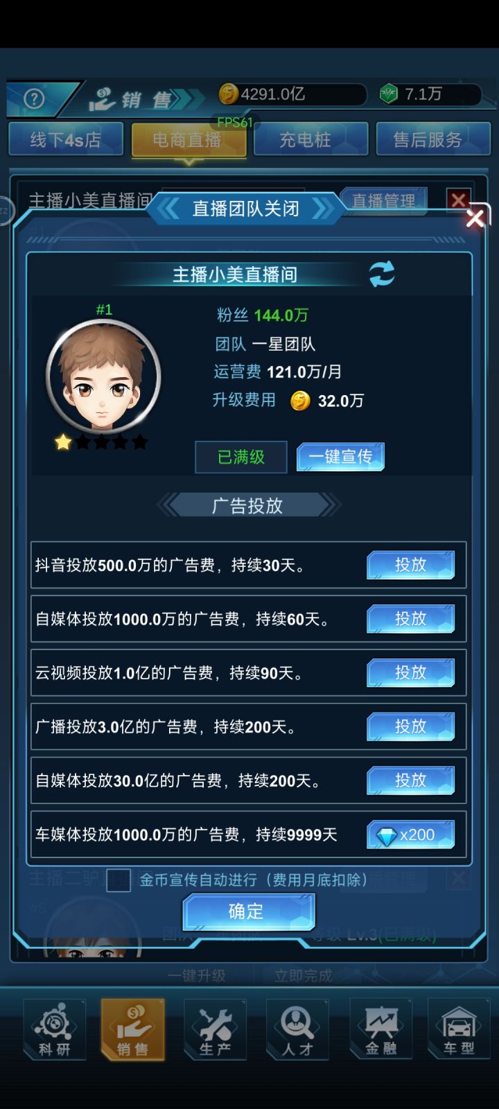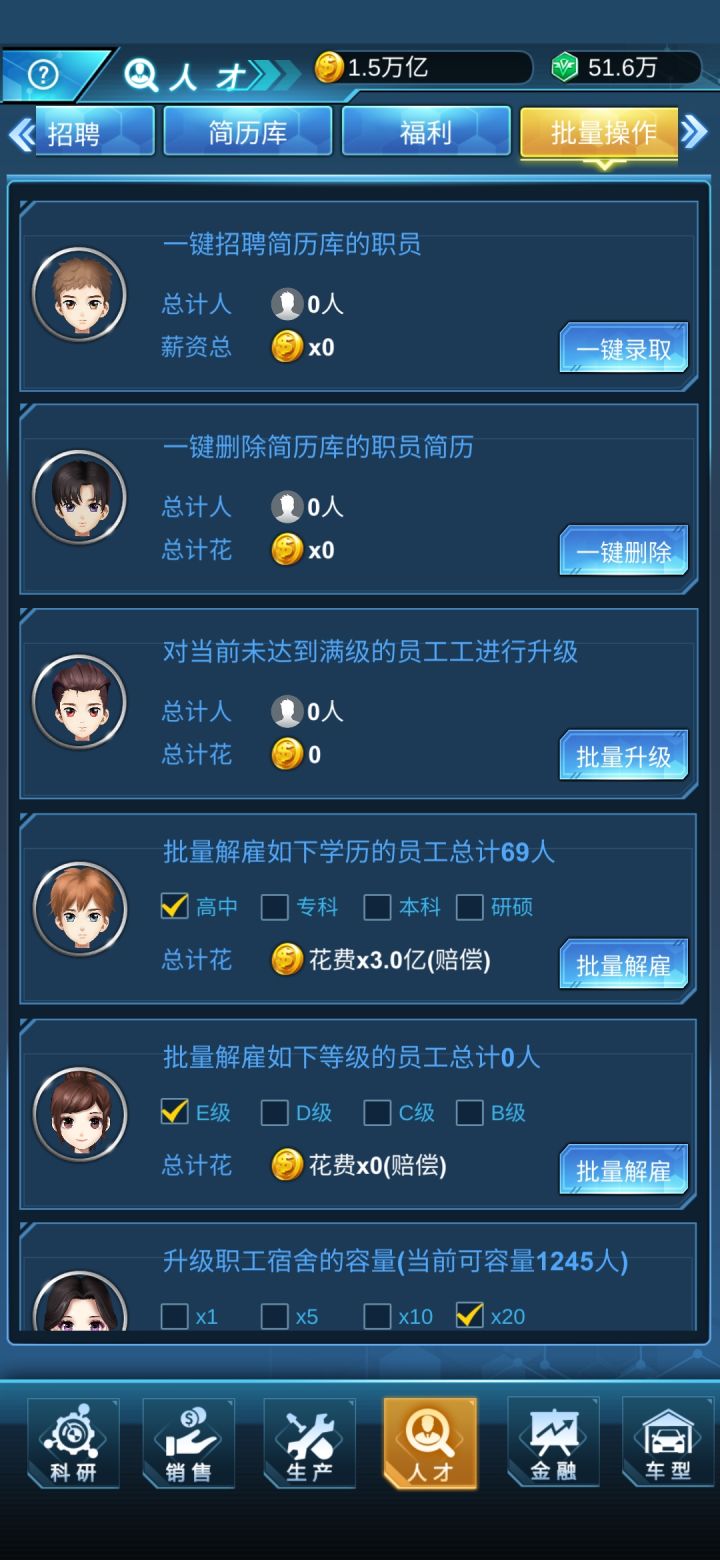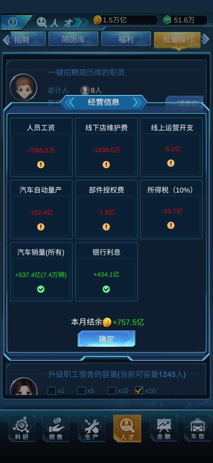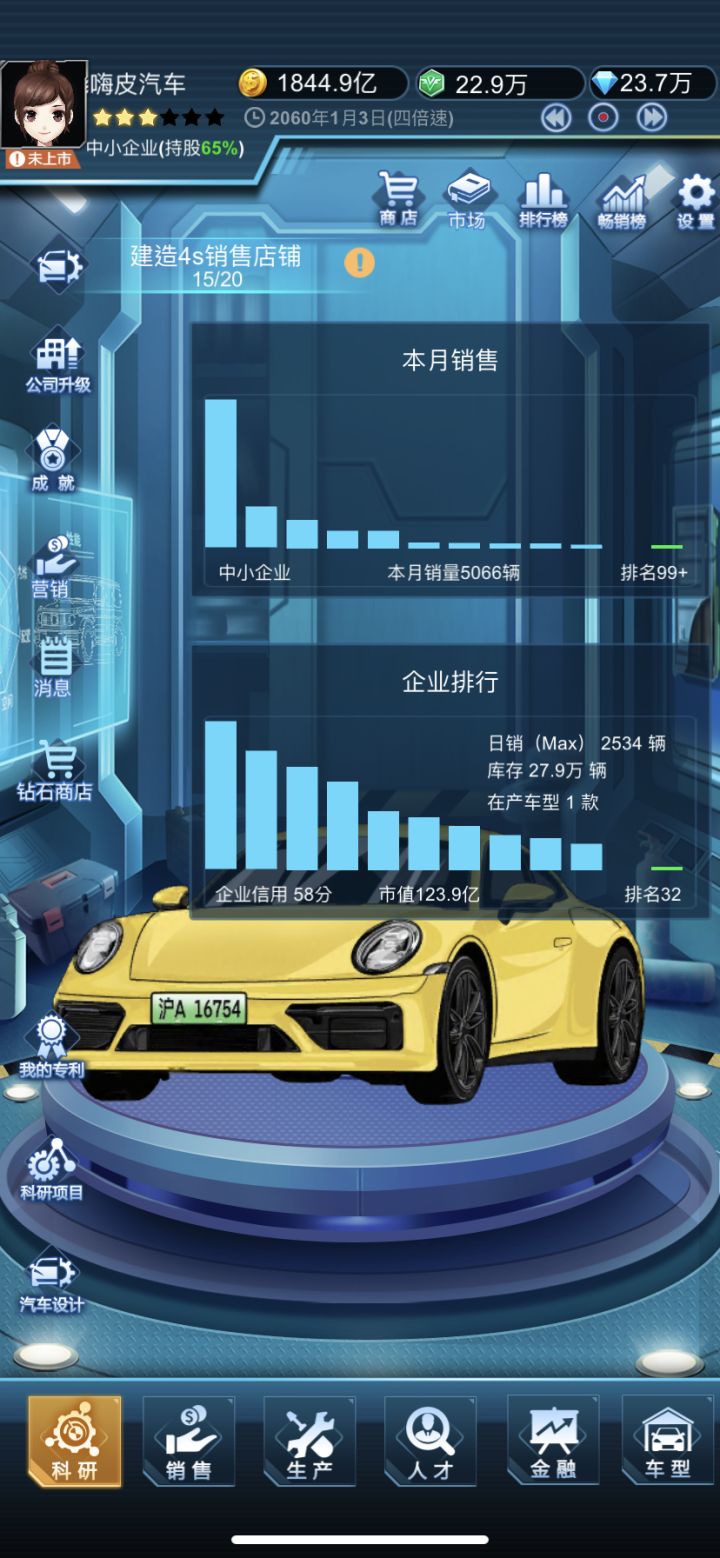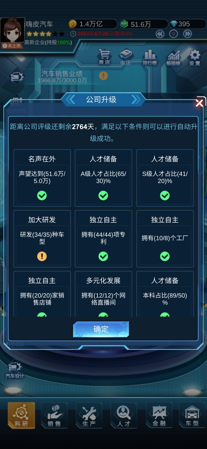 还有s等级的人一开始不要,跟着那个左边的公司升级的条件走,不要早点,还有注意五星企业之前那个售后的人全不要,充电桩售后服务全不要。其他就依葫芦画瓢没啥意思了。那个投资没卵用,要钱还不如存钱拿利息,后面钱没卵用就是等卖的车够才能升级