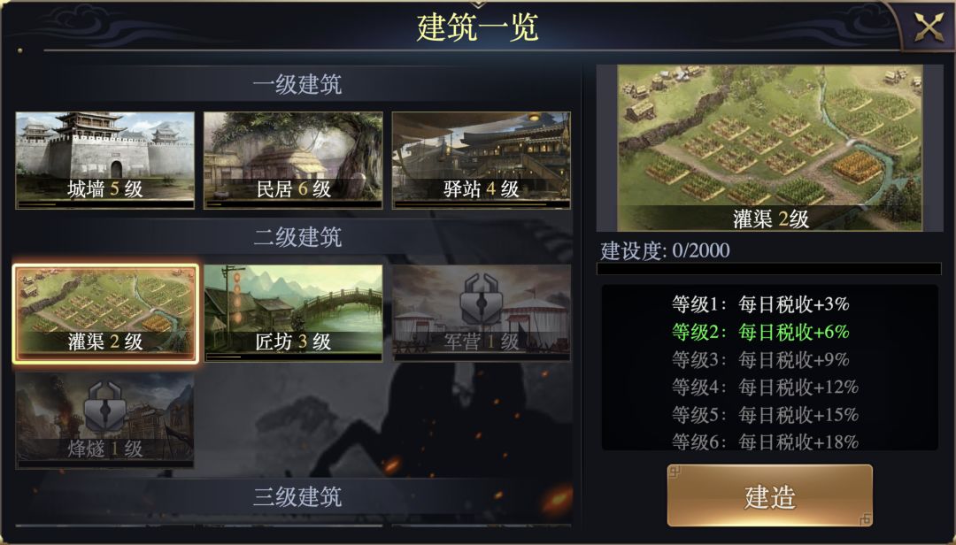 ,各位主公抓紧时间哦,今天给各位主公讲一下世界地图里的首都城池建设~~~ 城池建设分为四个等级,今天来看看二级建筑 【灌渠建设】 等级1:每日税收+3% 等级2:每日税收+6% 等级3:每日税收+9% 等级4:每日税收+12% 等级5:每日税收+15% 等级6:每日税收+18% 等级7:每日税收+21% 等级8:每日税收+24% 等级9:每日税收+27% 等级10:每日税收+30% 【匠坊建设】