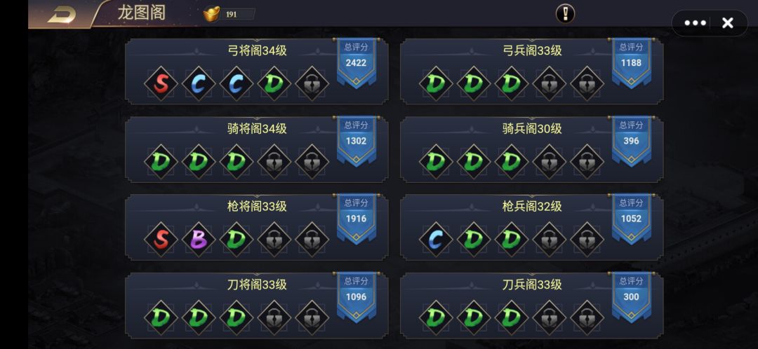 龙图阁是战力提升的重中之重,所以剿匪要经常剿,一些兵种的红将数量是不够的所以橙将也可以提前培养