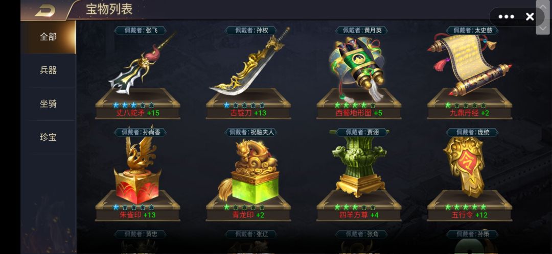 在游戏进行到一定阶段,随大殿等级和人物等级的提升会解锁藏宝阁,通过藏宝阁可以获得大量的战力属性加成,下面介绍藏宝阁的各项玩法。 每个红色武将(资质100以上)都有自己的专属宝物,在系统分类中的兵器坐骑珍宝并无什么差别,对提升战力来说都一样,只是需要注意最好给武将配上专属宝物,有专属属性加成。高资质武将的专属宝物相对来说更难获取,可以先给同兵种的武将宝物凑合着用用,比如孙权先用用孙坚的古锭刀,同属刀
