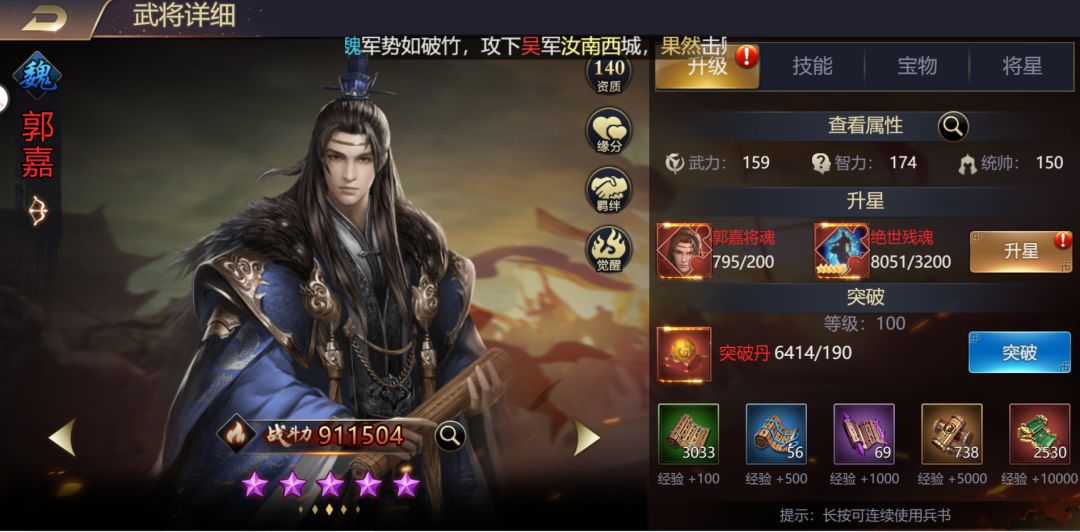 《三国之旅》图文攻略3武将培养篇(上) 武将是战力提升最重要的一个点,武将培养可以分为等级、升星、技能、宝物、将星、装备几个部分。 一、武将等级 武将等级提升所需经验书以及突破丹可以通过挂机关卡、酒馆累计招募、周功勋奖励、商城购买等获得。前期升级突破丹比较缺乏而经验书不缺,战功商城每天四次刷新的突破丹买满。后期武将多起来之后突破丹不缺而缺乏经验书,所以要提前攒。优先升级1队和2队武将。 二、武将升