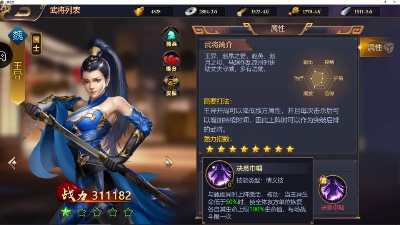 通过玩了一段时间的三国之旅,因为系统分配到魏国,所以对魏国武将有一定了解。现在把自己这段时间经验所得分享给大家。 首先王异和甄姬,甄姬可以通过开服游戏活动获得,降低获得难度,而王异就要靠手气了,最不济还有个2000抽自选礼包88垫底。甄姬的情义技可以给对手减怒,王异的情义技可以医疗全体成员生命,虽然全场只有一次,但全满生命的技能还是非常逆天的。所以强烈推荐王异。司马懿和邓艾这对组合可以充当主攻手,