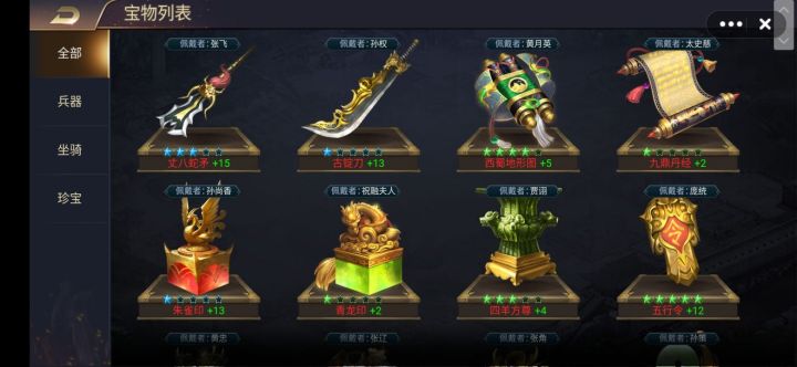 在游戏进行到一定阶段,随大殿等级和人物等级的提升会解锁藏宝阁,通过藏宝阁可以获得大量的战力属性加成,下面介绍藏宝阁的各项玩法。每个红色武将(资质100以上)都有自己的专属宝物,在系统分类中的兵器坐骑珍宝并无什么差别,对提升战力来说都一样,只是需要注意最好给武将配上专属宝物,有专属属性加成。高资质武将的专属宝物相对来说更难获取,可以先给同兵种的武将宝物凑合着用用,比如孙权先用用孙坚的古锭刀,同属刀