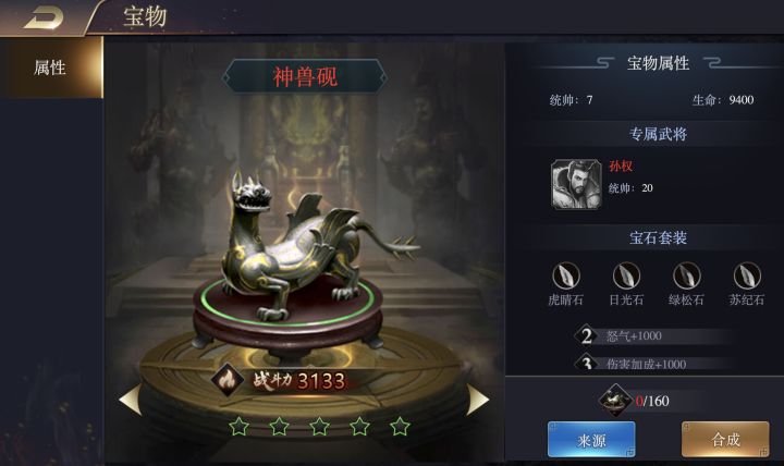 在世界四大文明古国之中,中国文明保存得尤为完整。在中国各地的博物馆中,你可以看到很多保存得很完整的古代物品,上至远古时期,下到明清,正如《国家宝藏》中所展示的那样,中国的文明渊源是你所想不到的,在《三国之旅》中就出现了很多你想象不到的逆天“珍宝”。【神兽砚】雕刻成神兽的外观砚台,外观华美,气度雍容。❀ 统帅:7 ❀ 生命:9400 ❀ 专属武将:孙权 ❀ 专属统帅:20❀ 宝石套装:虎睛石、