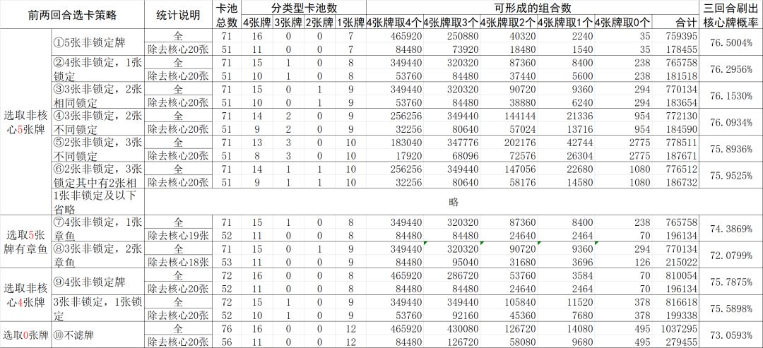 本来想发在营地的,但是等级低发不出去,发在这里抛个砖。之前在营地看到有人发的滤卡收益帖,数据非常模糊,感觉收益都偏大,后面经过自己计算得到了三本红的滤卡收益情况,其他卡组仅供参考,先上结论:(不跳本情况) (1)前两回合商店拿五张牌比四张滤卡效果好,第三回合刷到核心牌的概率提升超过1%。(见表格①与⑨对比) (2)滤卡拿非锁定卡比锁定卡效果提升0.2%左右(见表格①②④⑤) (3)前两回合滤五张与