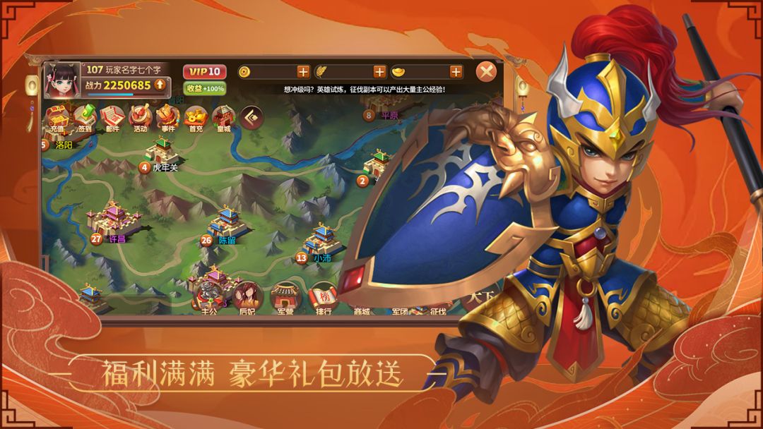 一款集养成与策略一体的游戏。玩家通过对自身武将的培养,宝石、装备、等一系列增加战斗力物品的收集,从而逐渐成长成一位可以影响大局的存在。当分属不同势力的玩家对战时,还需要考验各位玩家的战略头脑,通过武将、兵种、团队的配合战斗模式,使玩家充分体验游戏的乐趣。