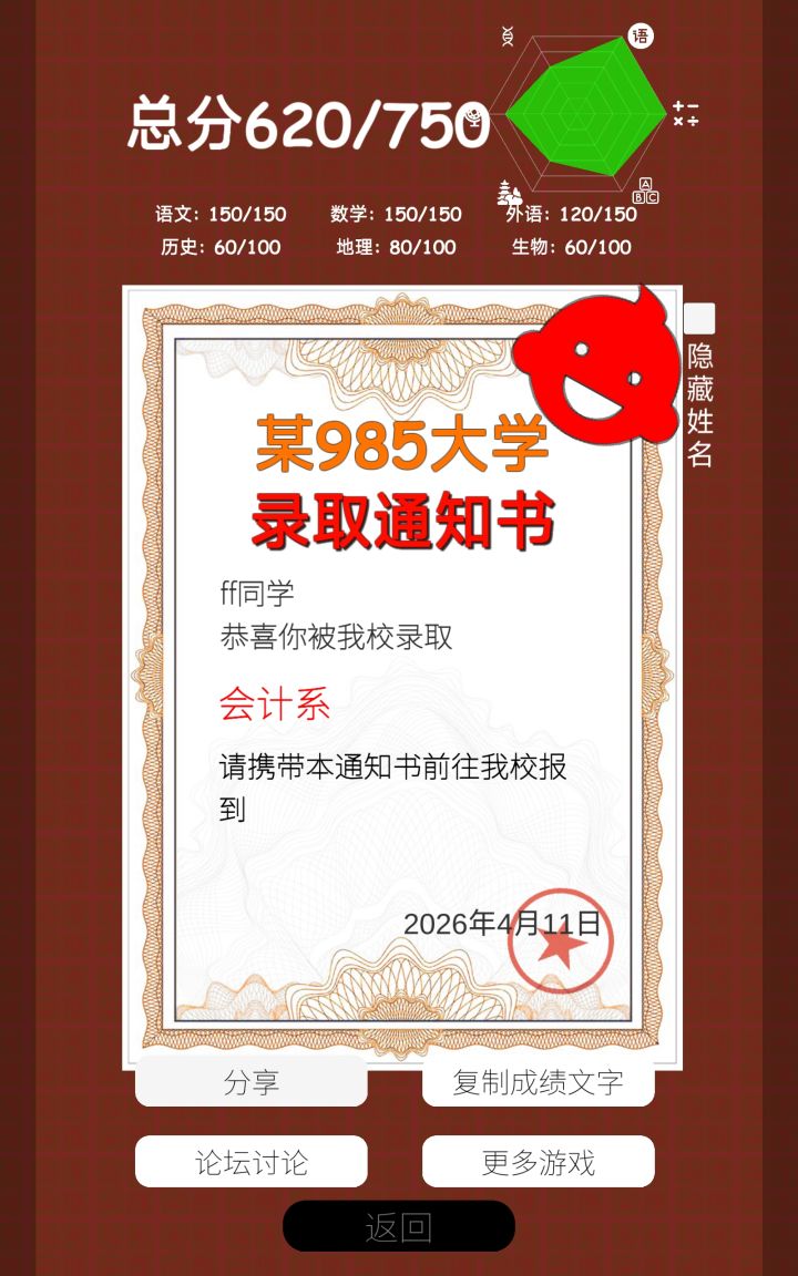 #我的高考 苯人25年高考考了608,在游戏里面选了在读高中生做出来是610……果然只有这个水平吗www