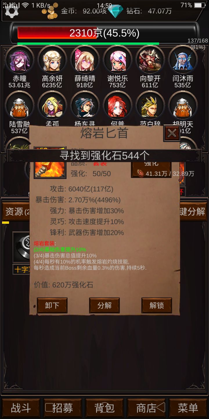 有朋友想看佣兵图 所以弱弱的发出来 供参考 我主要偏向寻宝和鉴定流 等级提高的攻击前期不如装备提高的快 到了后期 基本都是挂机 所以金币就没多少性价比了 仅仅个人看法 寻宝带来的强化石效益 远远比金币带来的加成多