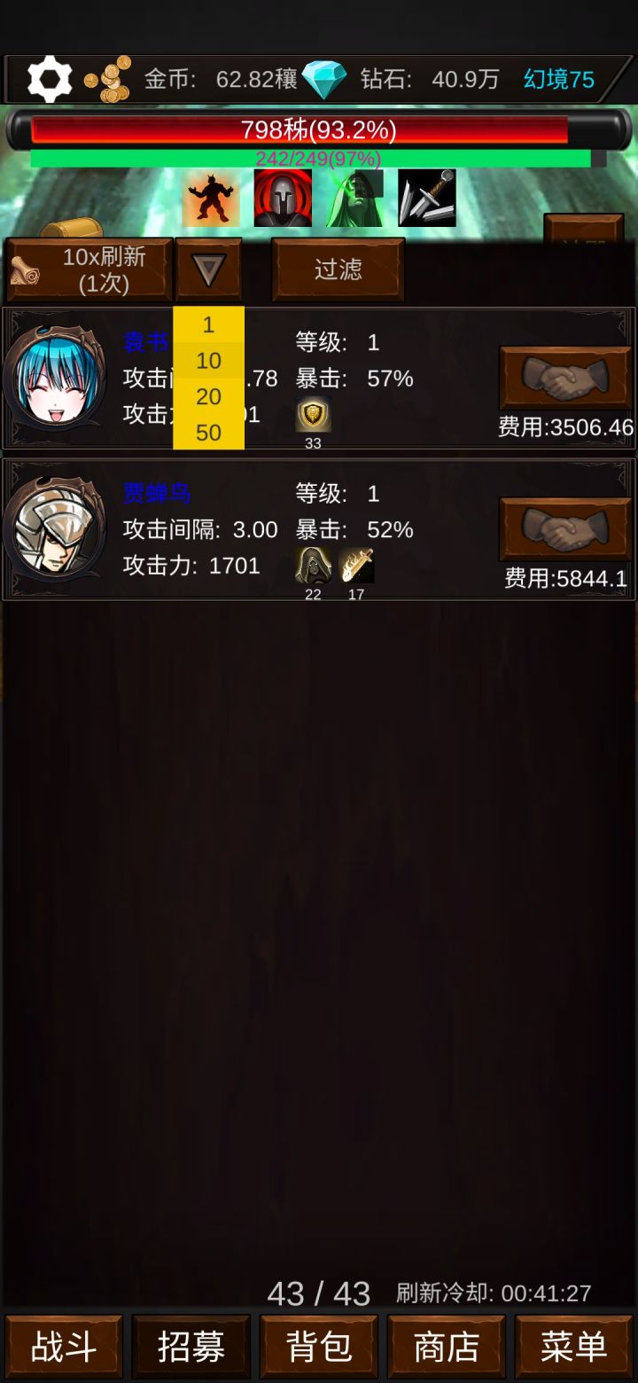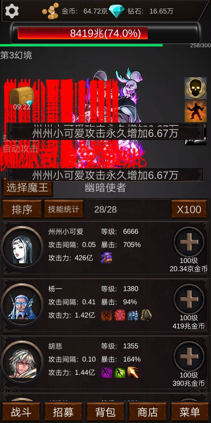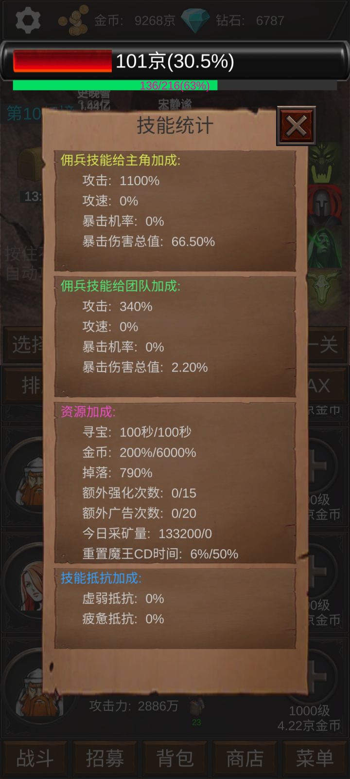 失败者的话,不管对错,没人听。所以,先上图。这游戏,起步速度一般手动挡2档的样子,不激情,也不拖沓。掌握不好佣兵技能搭配和强化节奏,前两天很难进入4-5档的激情区。佣兵数量和过关数量成正比,第一张图通关有28个佣兵,后面好像就不会再增加了。技能随机1-4个。游戏开始20-30个小时,优先金币>人物攻击>人物爆伤>人物速度,💎,物品,寻宝技能感觉前两天可有可无。运气好,来几个三技能,四技