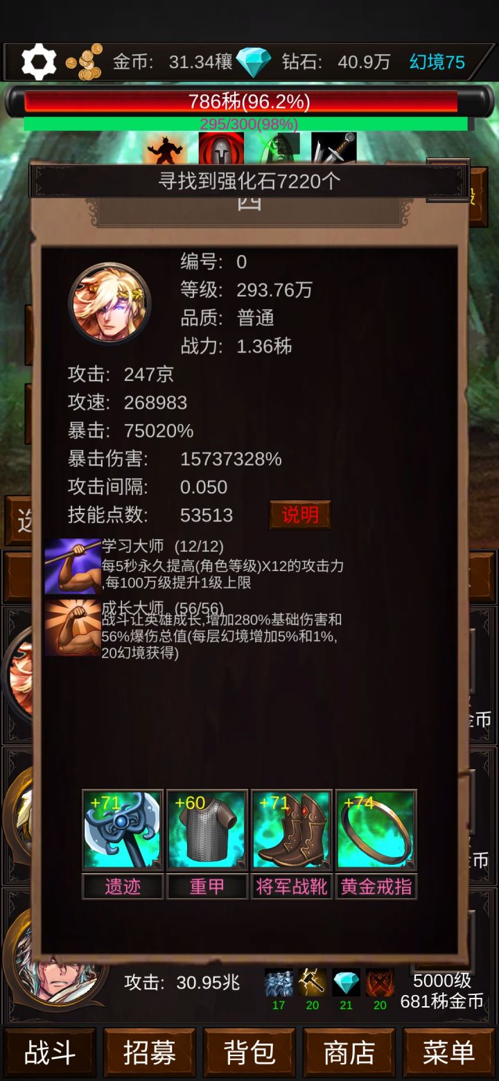 这个游戏,因为主角有一个唯一被动,5秒加攻击,这样注定主角一定要等级高,那么,看得出来,这个游戏绝对是主角吃饭,所以佣兵基本都是给主角打工这里面的钻石相当于其他游戏的充值B金钱也是很关键的,优先升级主角,其次佣兵,最后的最后才考虑其他的!首先第一个:装备装备其实都有好几条属性是可以被强化的,这里尤其需要注意,很多人以为强化就只强化一条,其实错了,只要不是字的词条,都可以被强化!装备注意优