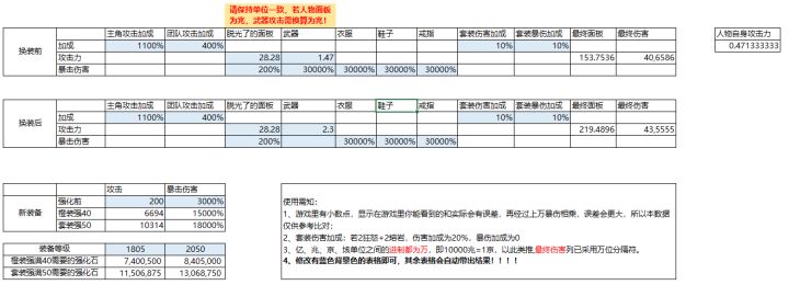 前期套装也没有必要一定要追求成套,套装和橙装混搭不一定就弱了,具体计算表格群文件我放了。武器即使没有爆伤,换他值不值,也可以算出来。