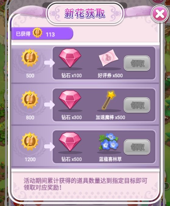 Hello~各位小主们,大家好呀!《开心花花乐》最新活动【花香满屋】上线啦~各位小主们是不是都已经开始忙着出售花篮领取奖励了呢? 【花香满屋】活动期间,累计获得道具数量到达指定目标即可领取对应奖励! 500道具领取100钻石、500好评券 800道具领取300钻石、500加速魔棒 1200道具领取500钻石、蓝楹喜林草 今天小花就来为大家算算,需要出售多少花篮才能领取蓝楹喜林草吧! 一个花台最多可