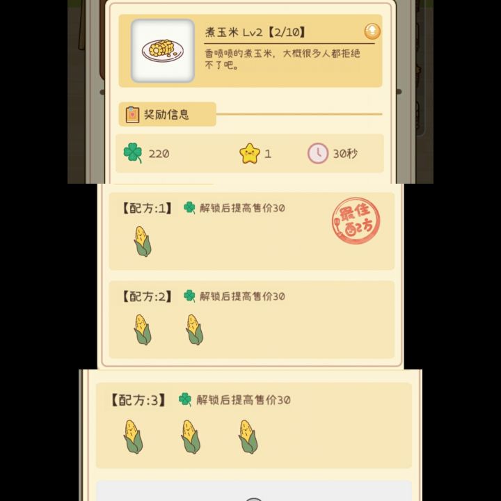 贴心的新手攻略来啦本篇包含:煮玉米(1、2、3);爆米花(1、5);玉米松饼(1);土豆泥(1、2);炸薯条(1、2);玉米土豆汤(1);茗茶(1);豌豆馒头(1、3、5);猫耳朵(1);兰州拉面(1)写在前面:超适合萌新观看,不用去纠结什么东西自己没有什么东西自己有。ps.厨房3级指能放入3种不同食材,时光厨房只需放入相应食材,无需放入正确的数量