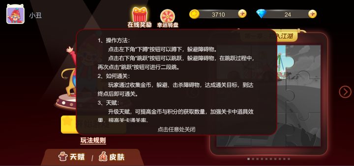 《我的马戏团》在传统玩法的基础上融入了经典国风元素的休闲跑酷游戏。让我们再次玩转儿时的马戏团,轻松陪你度过整个夏日。这里有丰富的场景地图:有晴朗的海洋沙滩有炎热的酷暑沙漠有寂静的星河平湖有极寒的冰天雪地各种地图上的关卡挑战等你来选。这里有多种人物角色可供玩家选择,每个角色都不同的属性加成或技能:有增加生命的小丑有增加积分的京剧人物有急速冲刺的哪吒更有摧毁障碍的悟空。在游戏