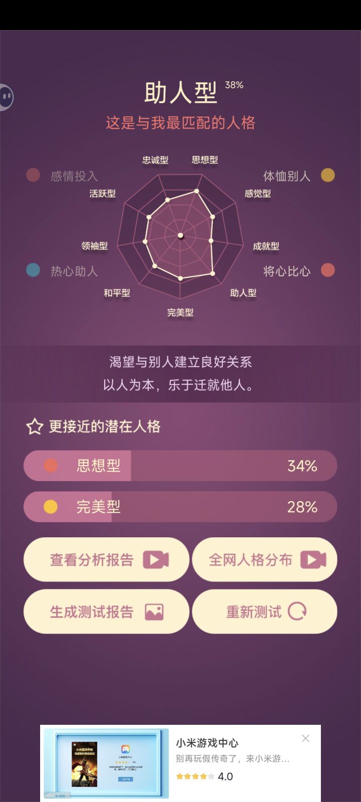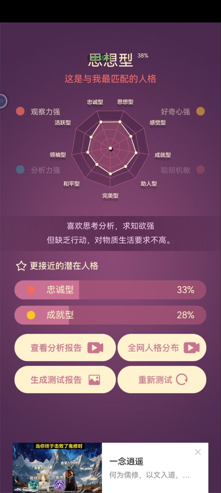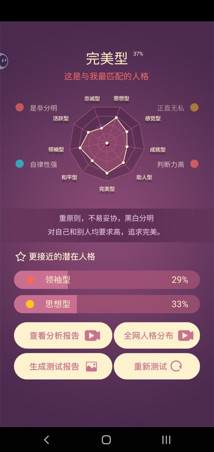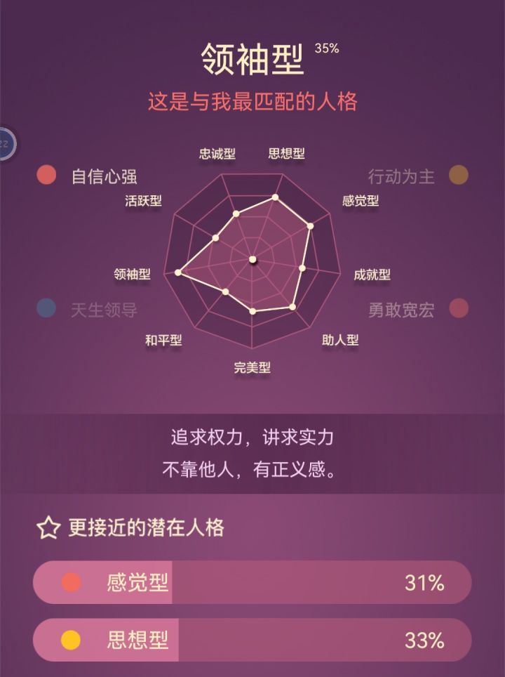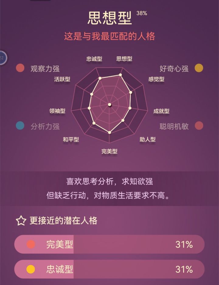 (⏰深夜碎碎念时间🕐)做完测试发现去年也做过一次,突然就有了记录的想法。(拖延好重,明明13号做的测试结果30号才写)和去年一样啊,还是两种。「思考型」是量小的测试题的结果,而「领导型」是另外一百多道题的结果。----------至于为什么是两种结果我也不太清楚,一开始以为是人格**什么的,因为这两种类型看上去完全像是两个人直到我看到解析中的「性