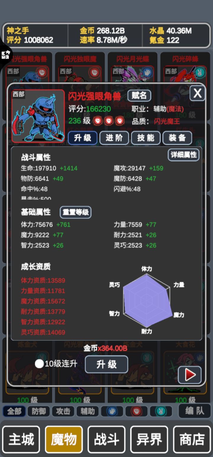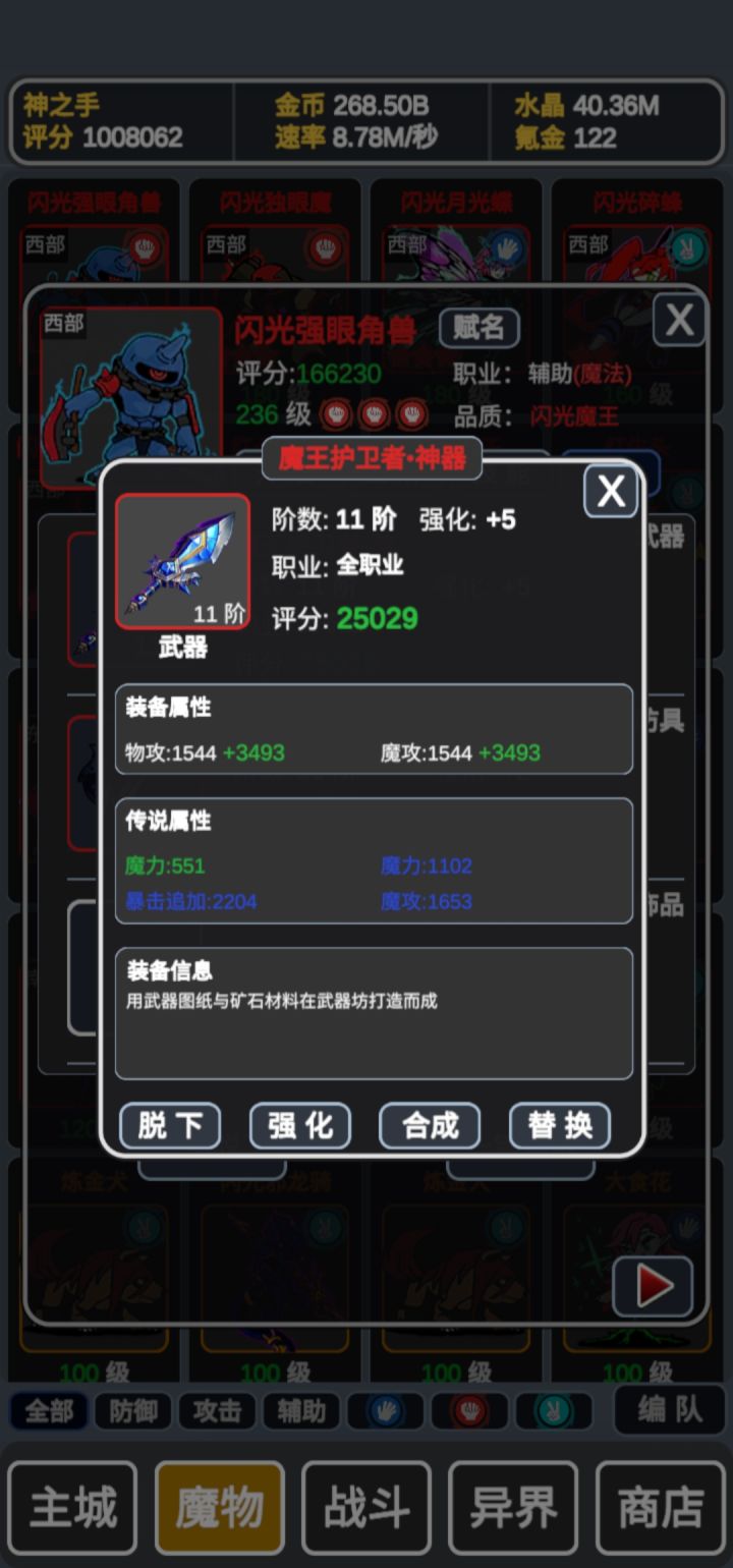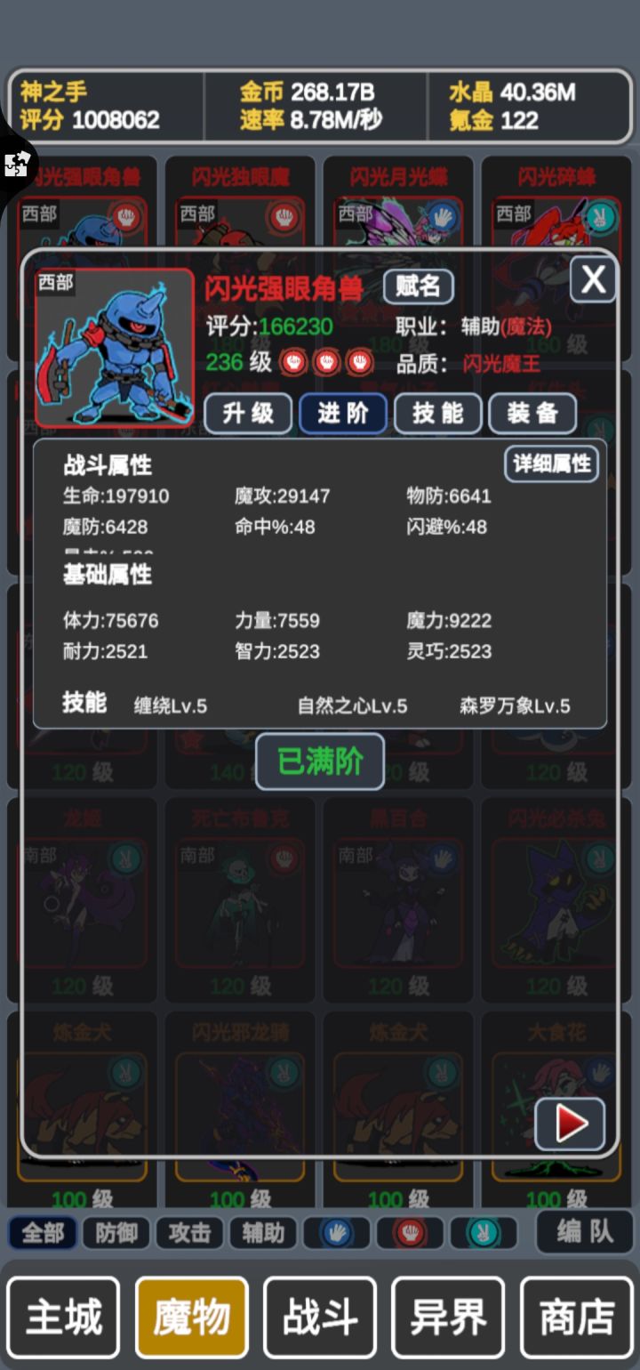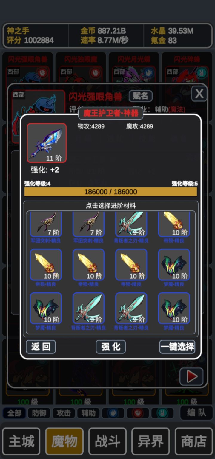 2021年11月5日-11月19日测试,纪念下。1、六星角神没做好,进阶后不加评分,还变零星角神😂;2、五级极品11阶武器😃;3、镜像210关;4、东部200关毕业,南部西部可以刷十阶武器和防具。期待下一测六星能弄好,升六浪费一个三星红魔物本体啊,不浪费都能弄个四星,评分还能再涨一波😁。