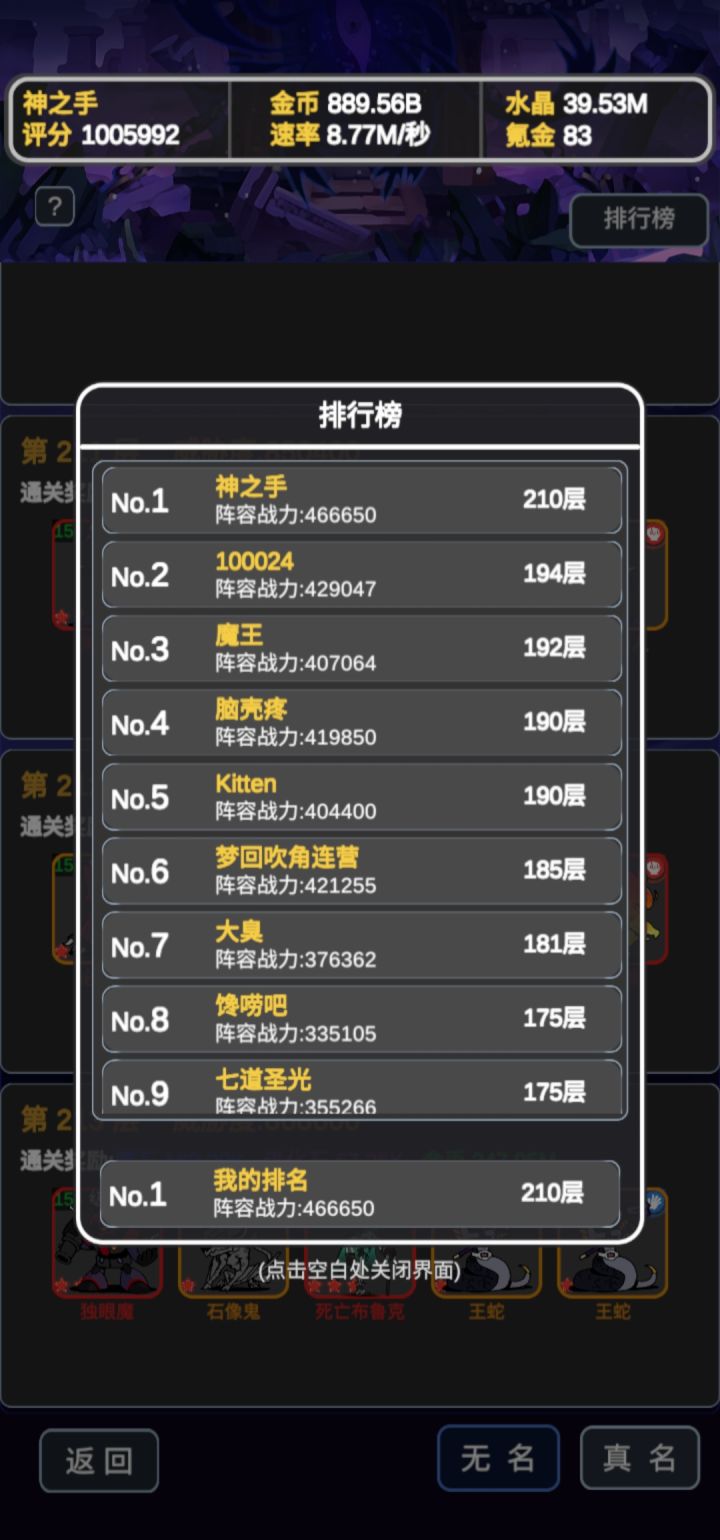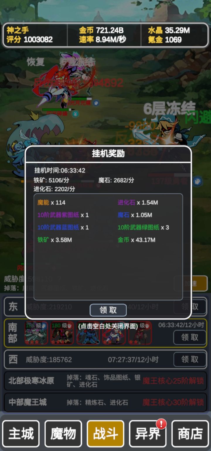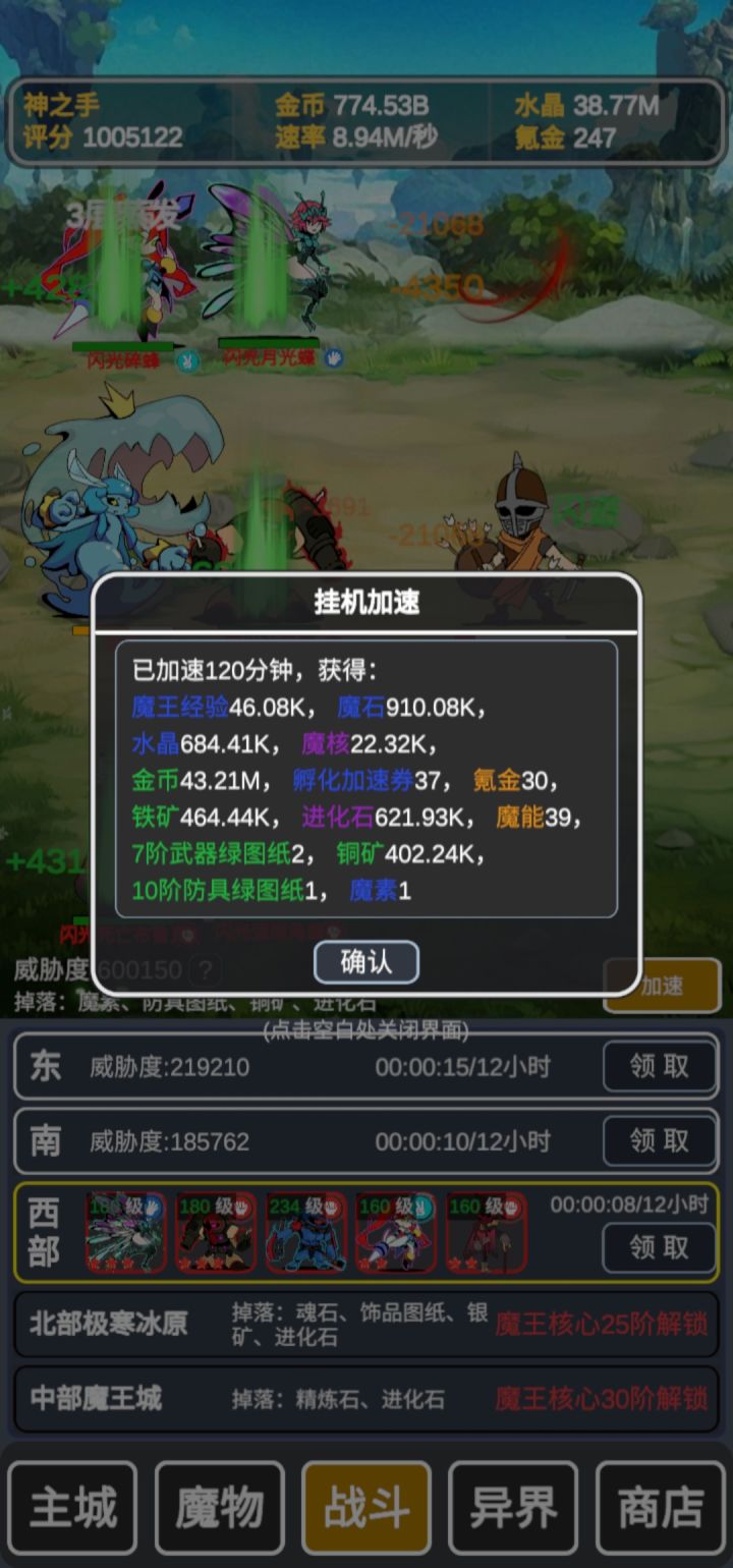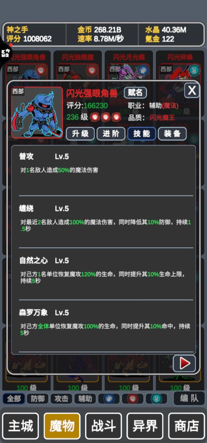 2021年11月5日-11月19日测试,纪念下。1、六星角神没做好,进阶后不加评分,还变零星角神😂;2、五级极品11阶武器😃;3、镜像210关;4、东部200关毕业,南部西部可以刷十阶武器和防具。期待下一测六星能弄好,升六浪费一个三星红魔物本体啊,不浪费都能弄个四星,评分还能再涨一波😁。