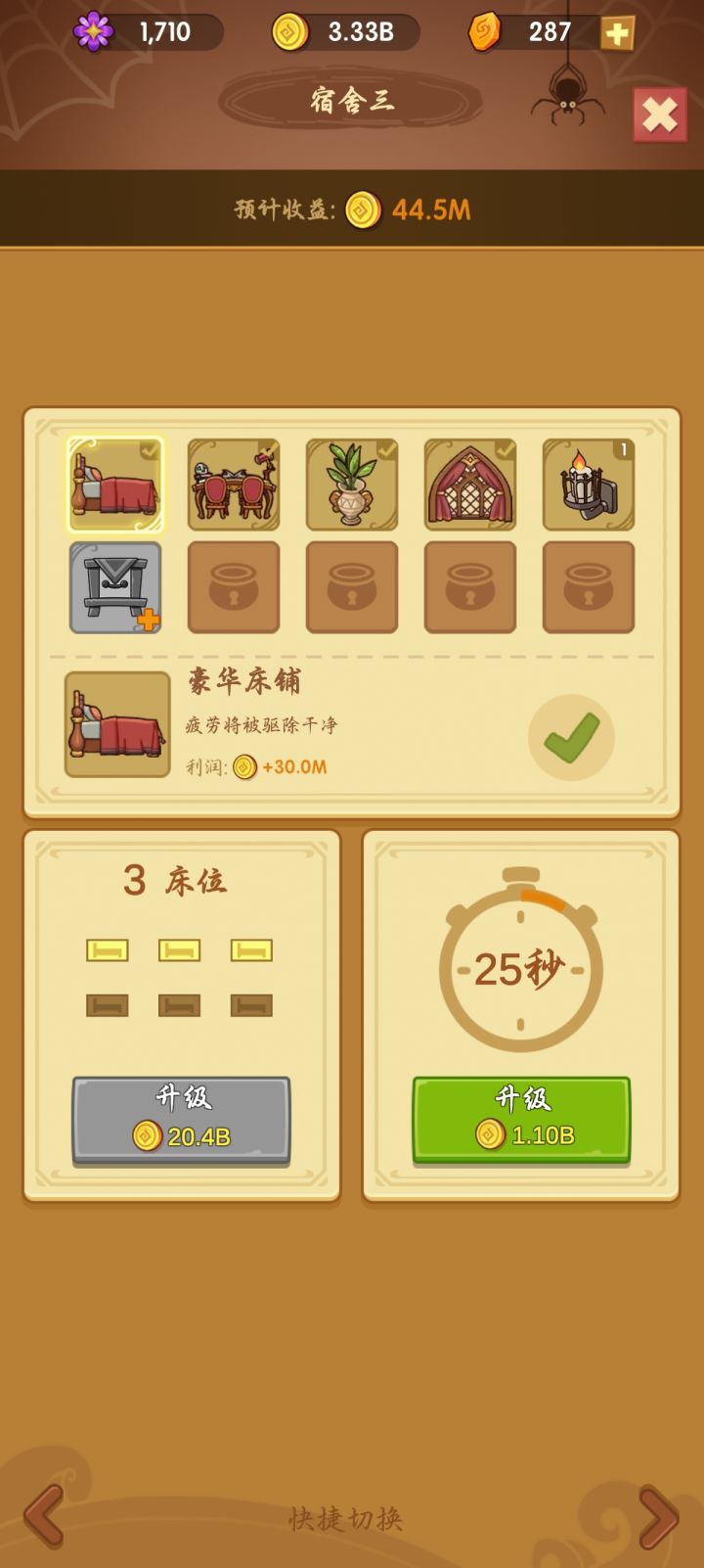 看到评论有玩家提到后面解锁场景需要几百万金币的,费时间的,我想说的是到后面你商店的收入也是十几万/分钟来算,许愿屋也是几十万/次抽取金币,你的收益和付出是成正比的,只要前期把神秘事务司里收益相关的功能点满就好了(学院收入和报名费用)