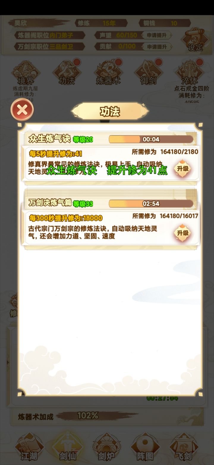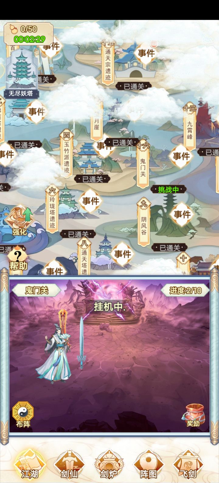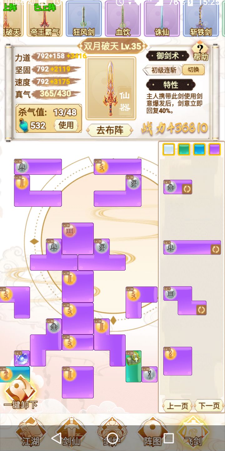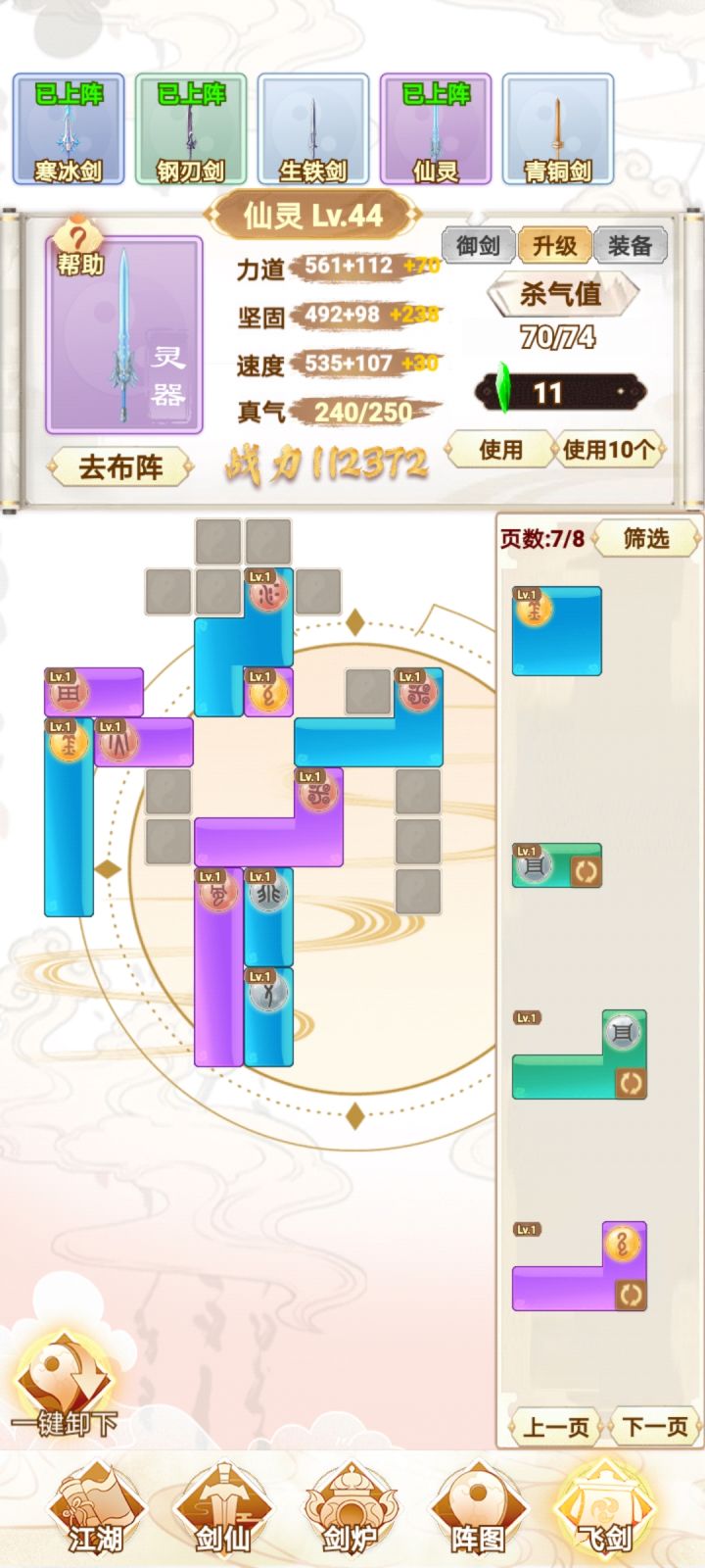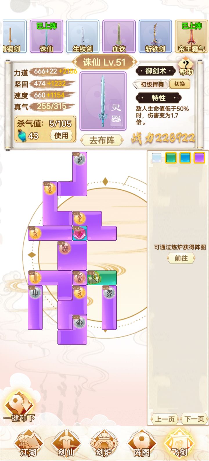 咸鱼 断断续续玩了十多个小时 现在已经通关了 还是很简单的 前期就靠一把剑一直推图 所有的阵法全放上就完了 中期就慢慢换 我基本上都没叠过速度 直接力道拉满 中间卡了一下关 强化一下阵图就能过了 难度不高 只是感觉最后两把灵剑合成有点过于麻烦 中间看攻略还以为合成公式有问题 结果炸了一遍 那时候心态有点小崩 不过还好 几分钟后又弄了一遍 就合成出来了 后边就靠两把剑 把阵图一强化 基本上就很容易打通了