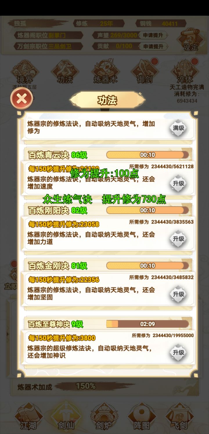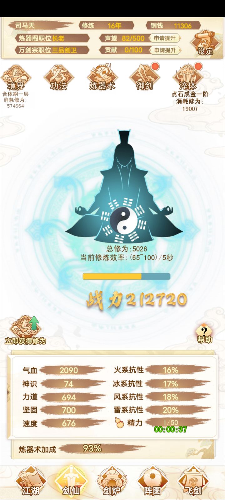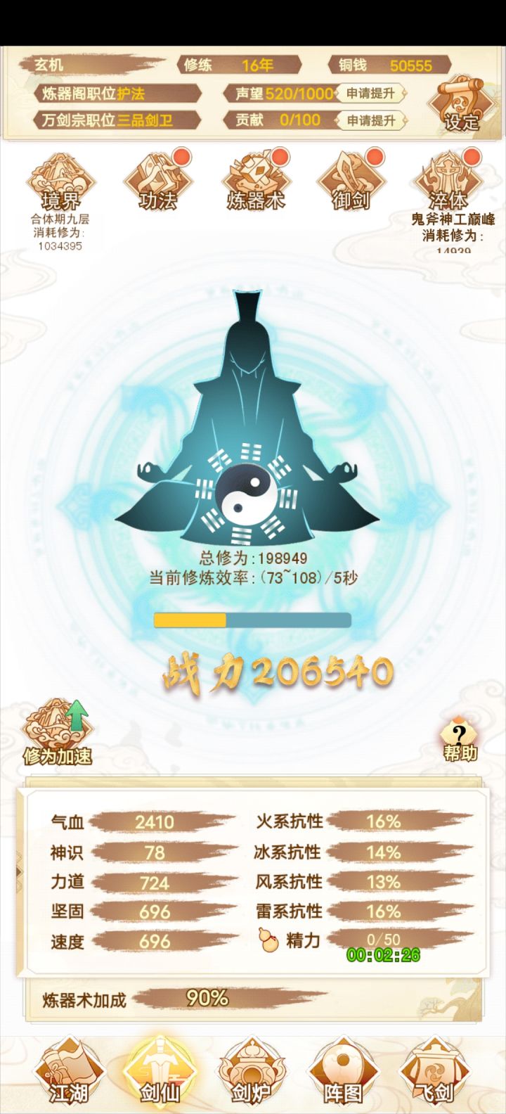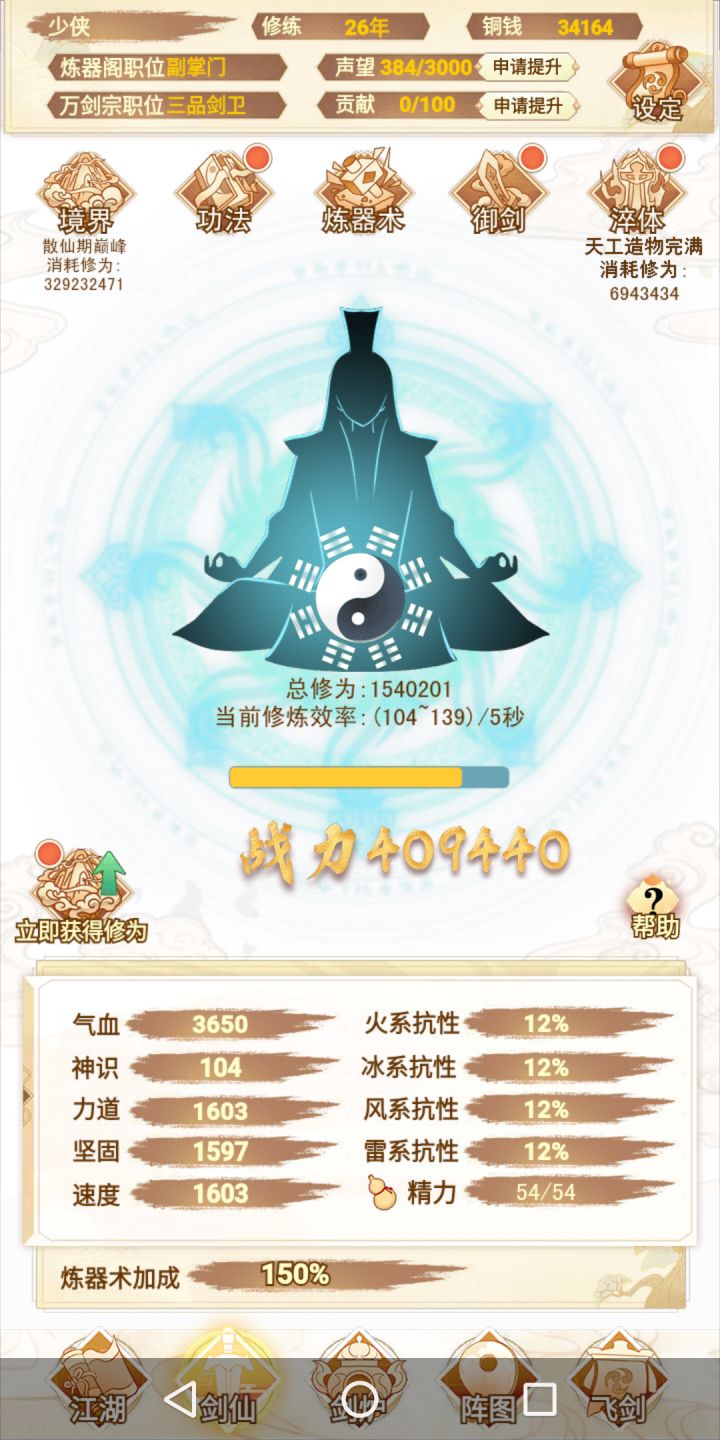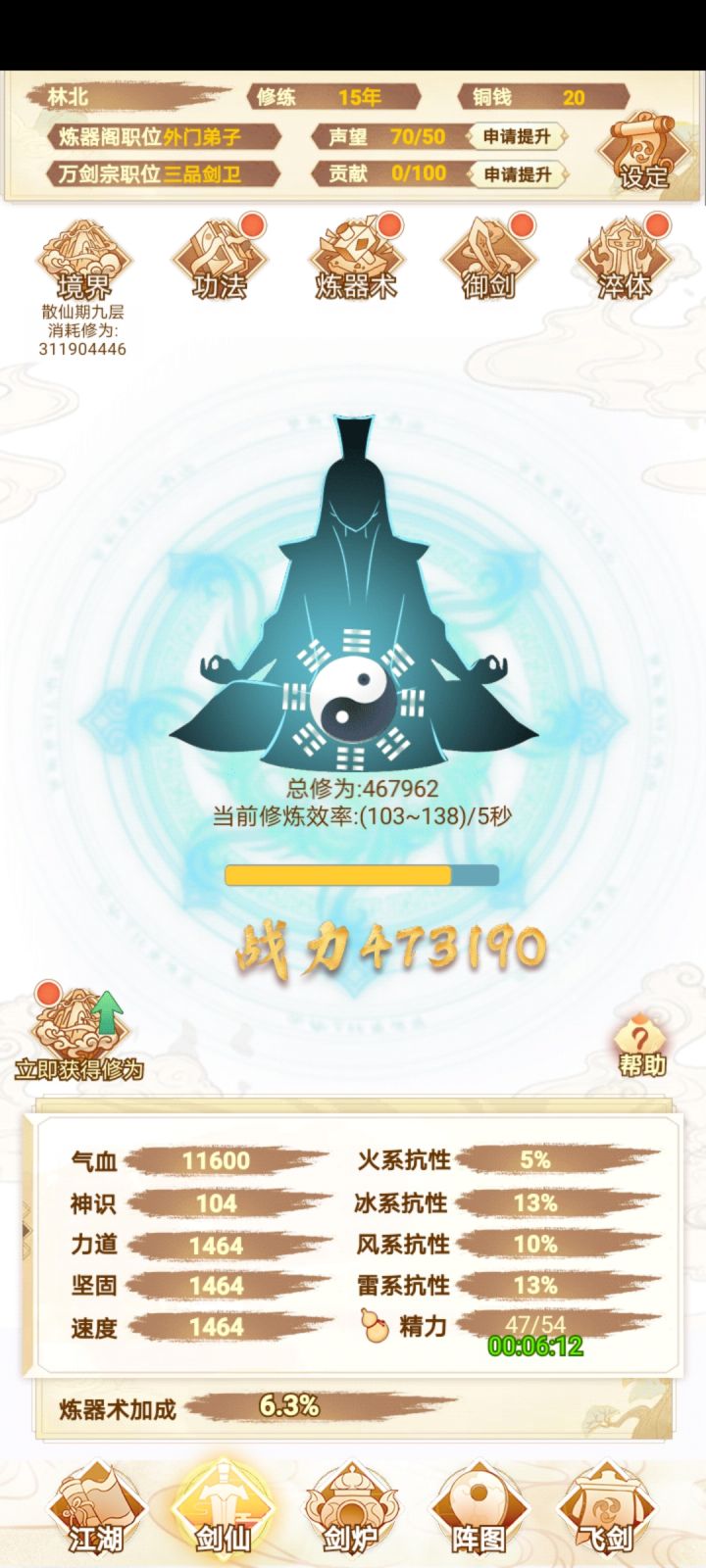 咸鱼 断断续续玩了十多个小时 现在已经通关了 还是很简单的 前期就靠一把剑一直推图 所有的阵法全放上就完了 中期就慢慢换 我基本上都没叠过速度 直接力道拉满 中间卡了一下关 强化一下阵图就能过了 难度不高 只是感觉最后两把灵剑合成有点过于麻烦 中间看攻略还以为合成公式有问题 结果炸了一遍 那时候心态有点小崩 不过还好 几分钟后又弄了一遍 就合成出来了 后边就靠两把剑 把阵图一强化 基本上就很容易打通了