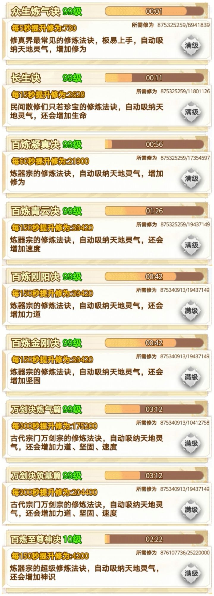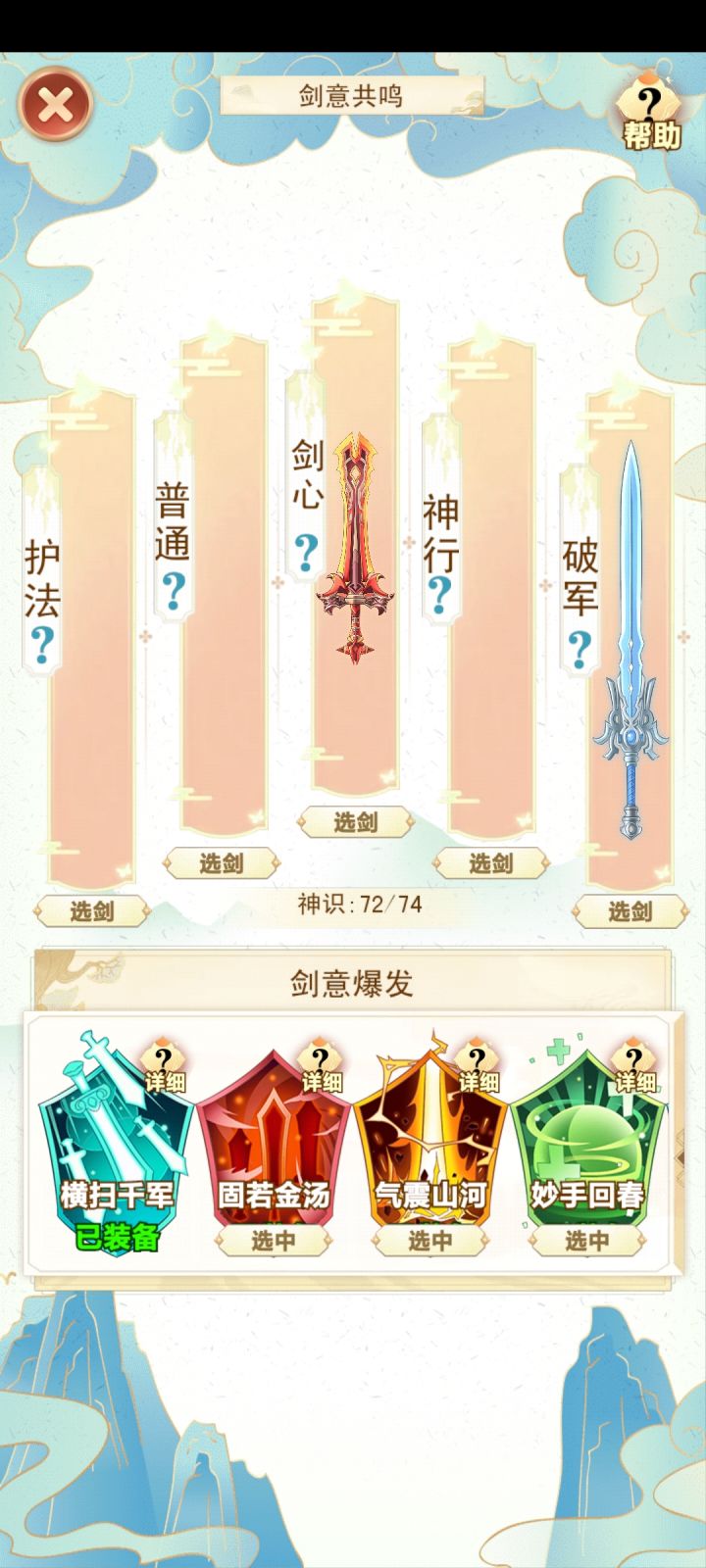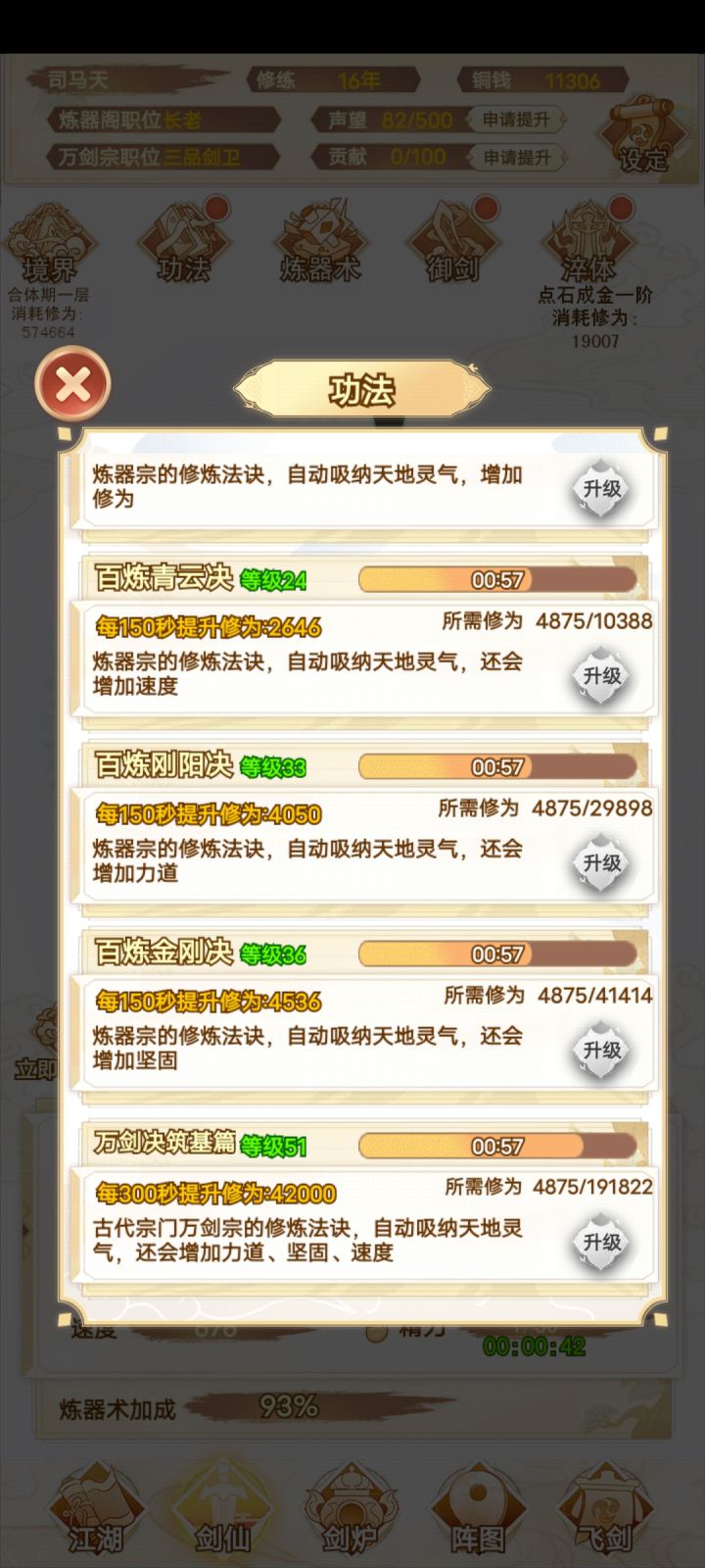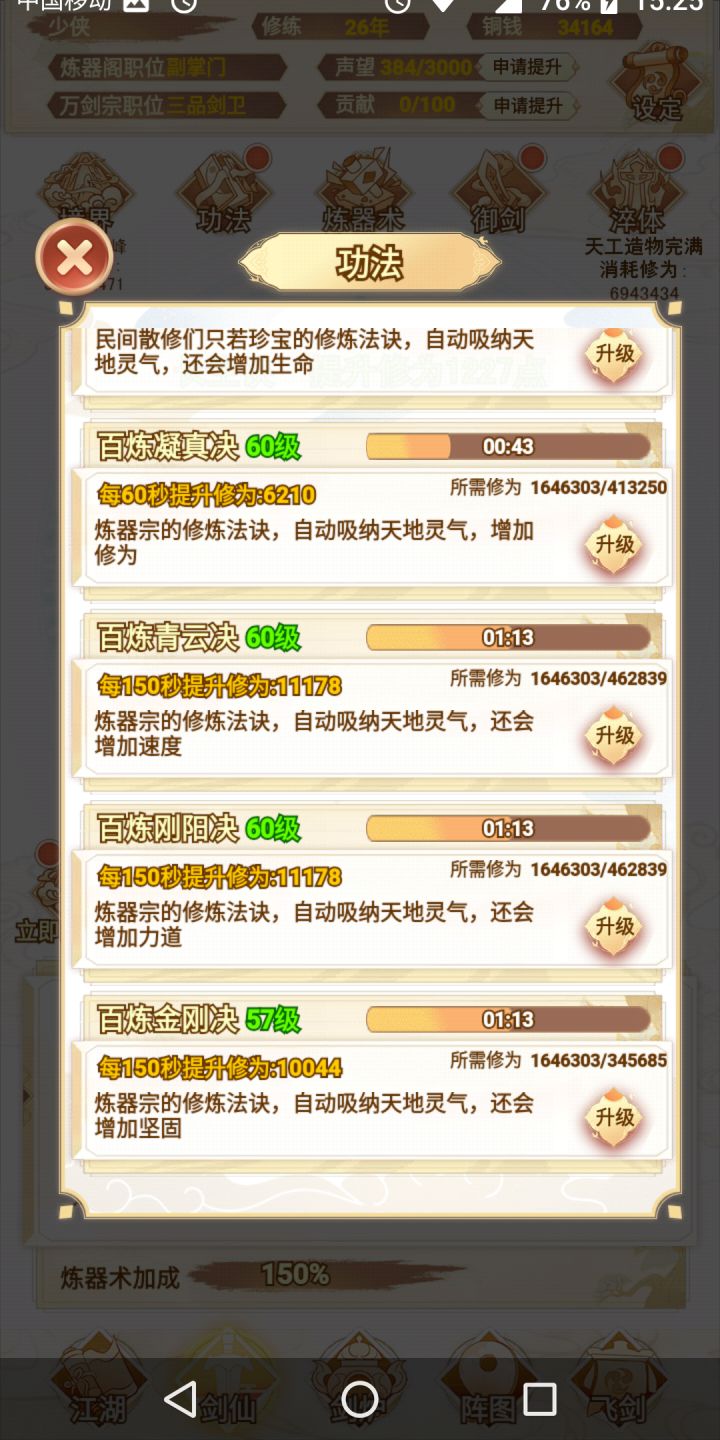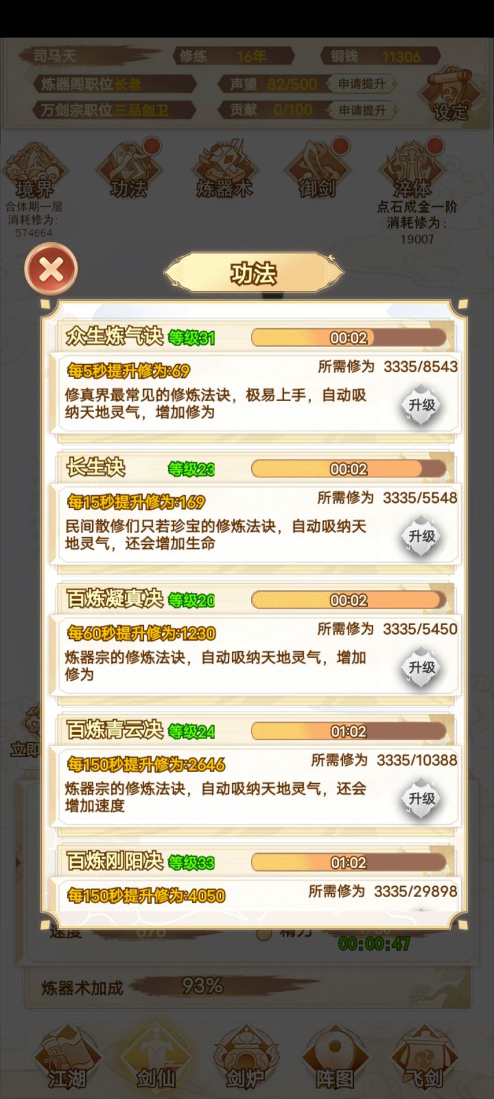 咸鱼 断断续续玩了十多个小时 现在已经通关了 还是很简单的 前期就靠一把剑一直推图 所有的阵法全放上就完了 中期就慢慢换 我基本上都没叠过速度 直接力道拉满 中间卡了一下关 强化一下阵图就能过了 难度不高 只是感觉最后两把灵剑合成有点过于麻烦 中间看攻略还以为合成公式有问题 结果炸了一遍 那时候心态有点小崩 不过还好 几分钟后又弄了一遍 就合成出来了 后边就靠两把剑 把阵图一强化 基本上就很容易打通了