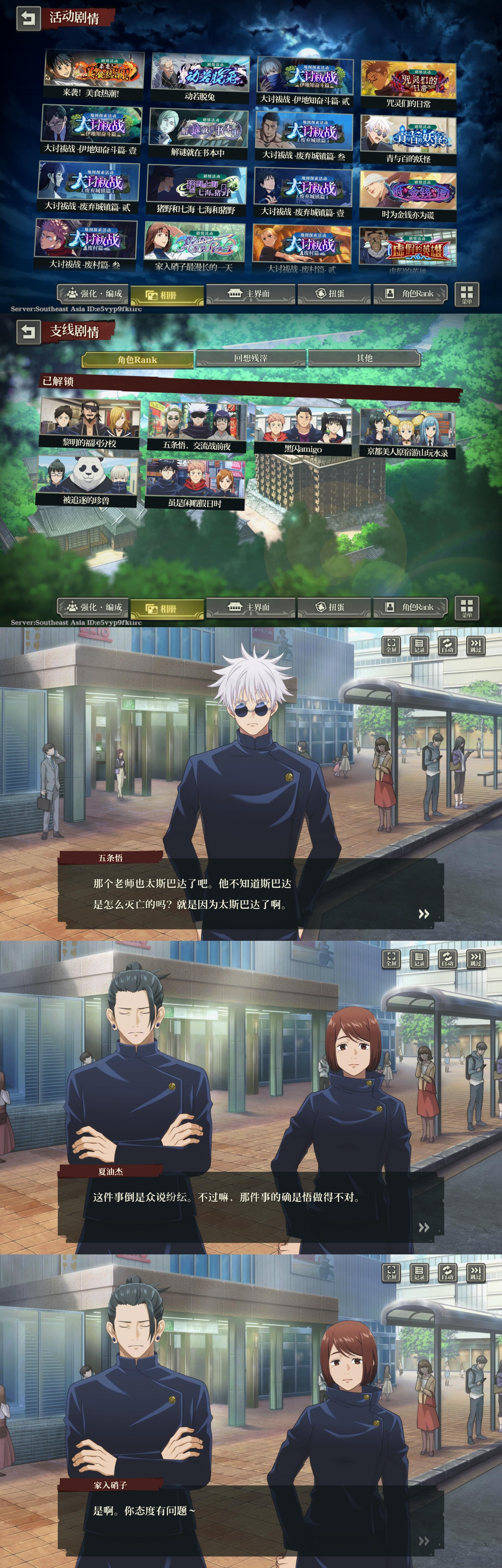 剧情方面:目前原作剧情更新到宿傩与漏瑚的对战,角色动作比较多,就是音效有点塑料(笑死我了),背景音乐也还可以,剧情中会放一点原作的动画,但也有手游自己的动画(比如五条悟被封印的内容);有原创剧情,是有配音的(和原作一个配音),非常喜欢🥹。可以跳过剧情,会有剧情记录